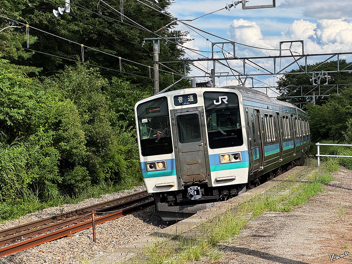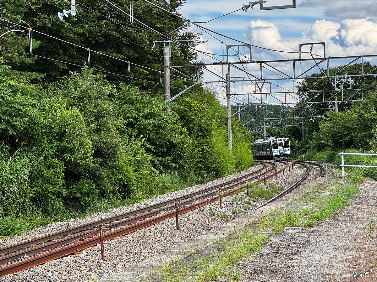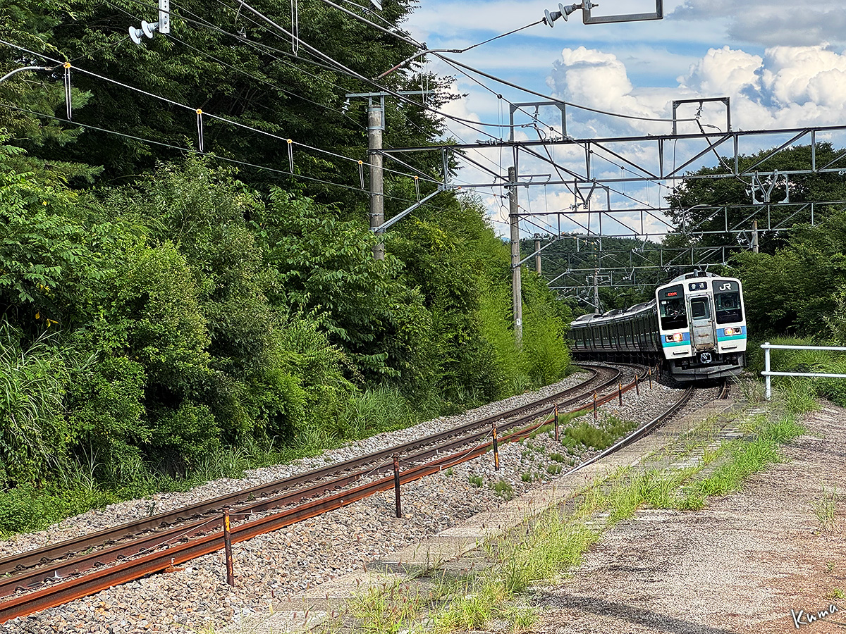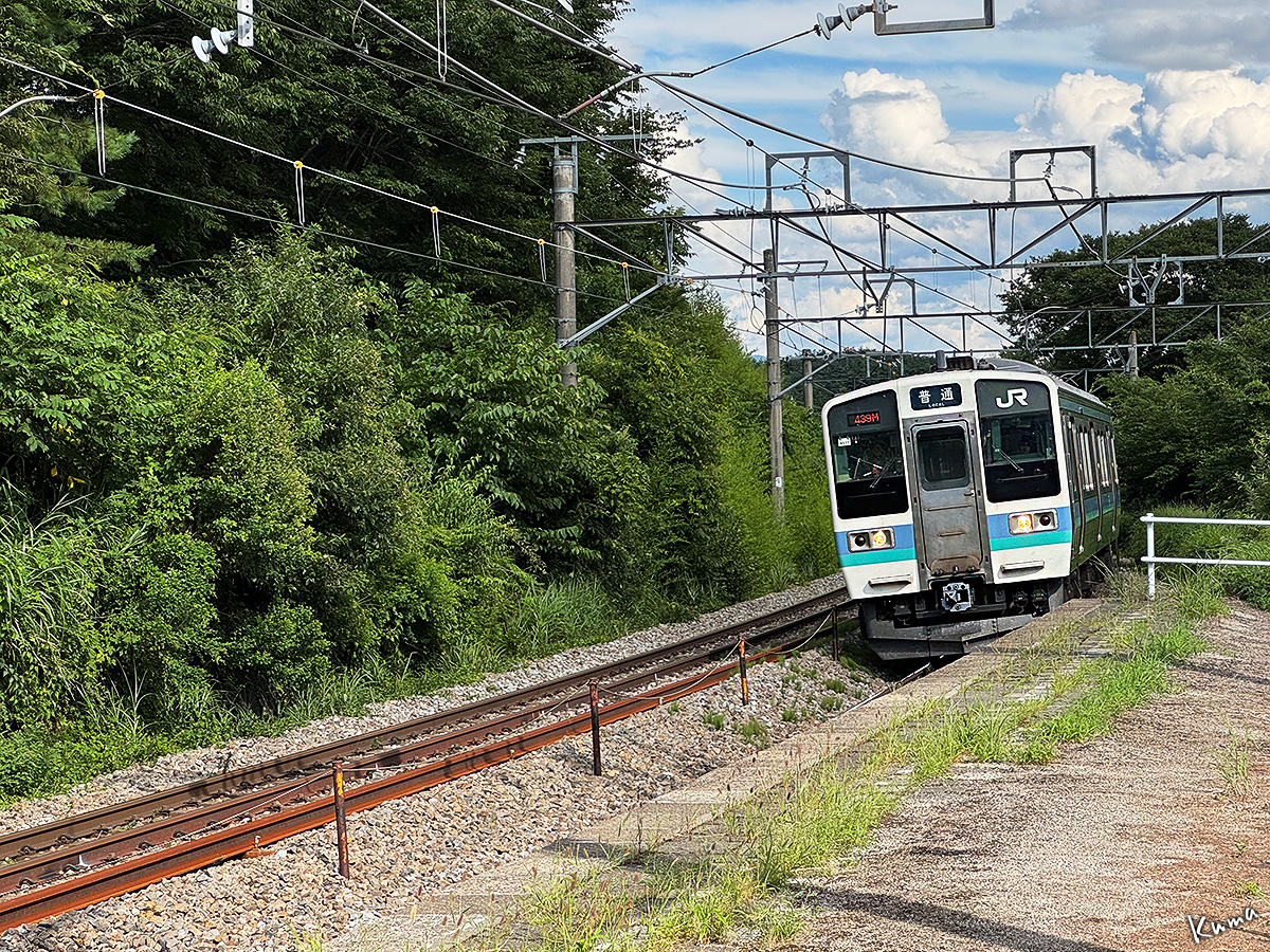投稿日: 2025年9月5日2025年9月4日 投稿者: くまぱぱ列車番号439M ここは信濃境駅下りホーム。 下り普通列車が到着する。 車両は長野色211系の6両固定編成。 この列車は大月駅13:45発の松本行きだ。 松本駅には16:58に到着する。