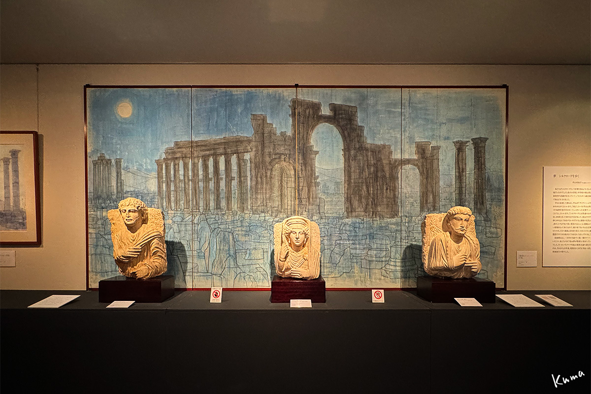 巨大なシルクロードの遺跡の大下絵。手前の彫像など、仏像と言うよりギリシャ彫刻に近いような気がする。