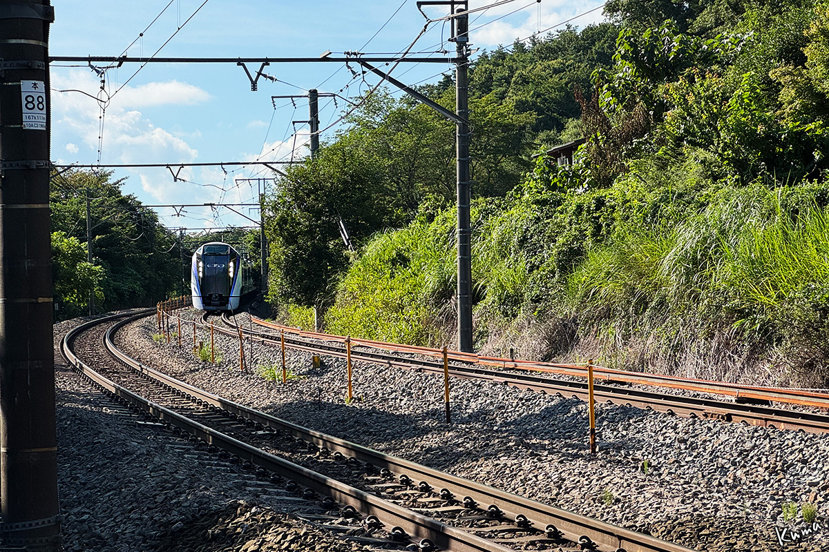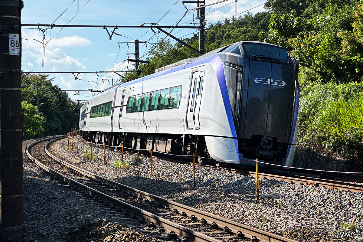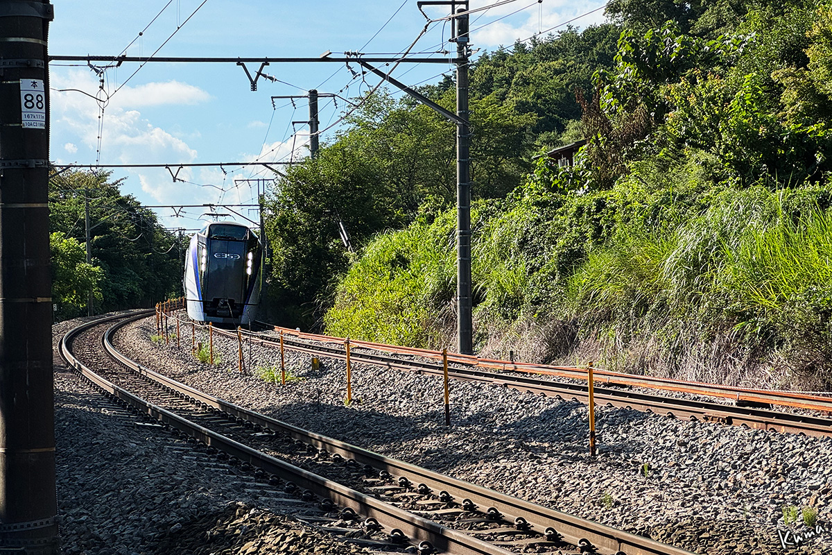 投稿日: 2025年9月16日2025年9月15日 投稿者: くまぱぱあずさ38号 E353系が走ってくる。 この列車は小淵沢駅の時刻表には出ていない。 一日に上下それぞれ2本だけの小淵沢駅を通過する列車だからだ。 列車番号M38。大糸線白馬駅始発の新宿行き定期特急列車だ。 13:41、3両編成で白馬駅発。松本駅14:46着、14:50発。この4分間で9両増結し、12両編成となる。 終点の新宿には17:25に到着だ。