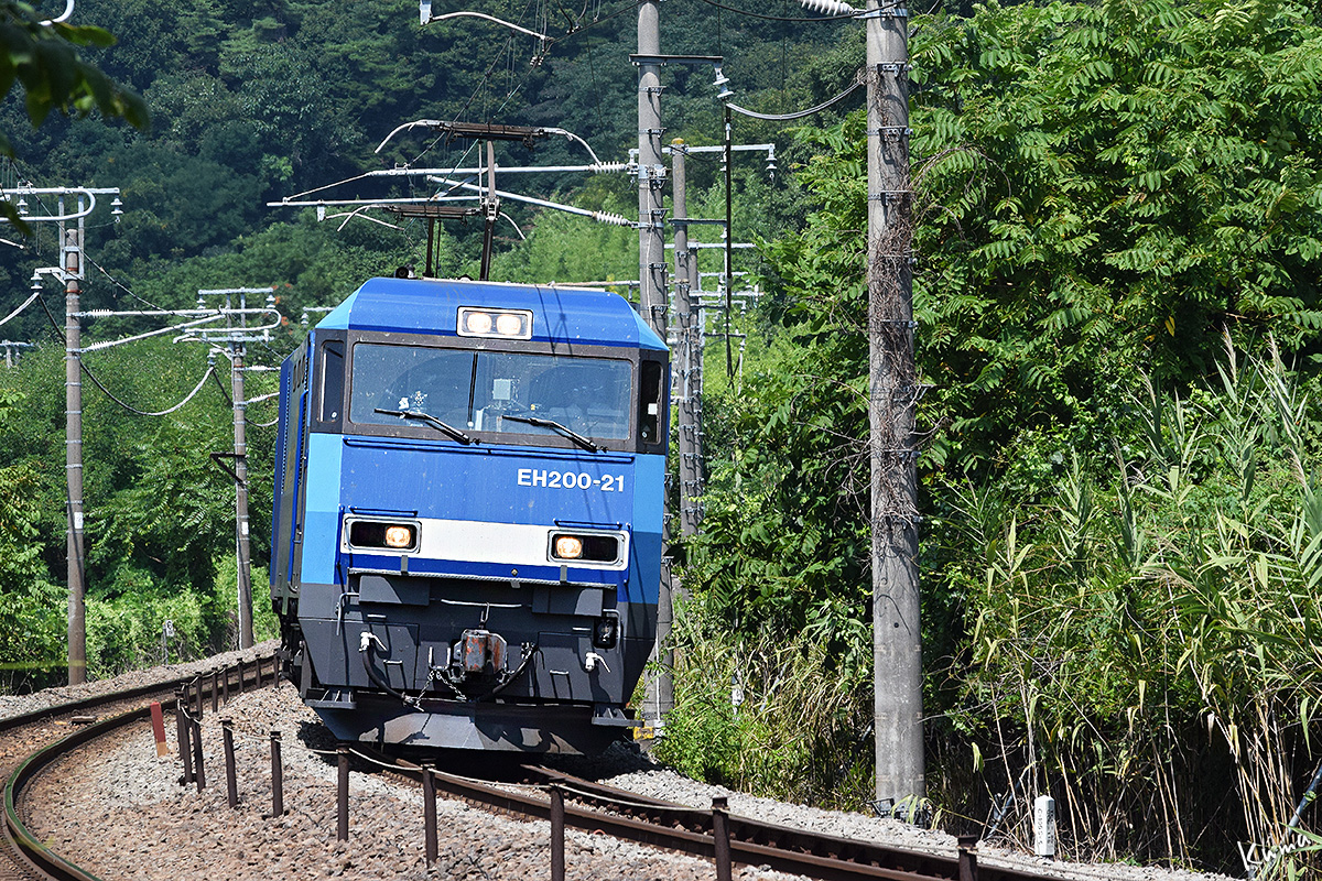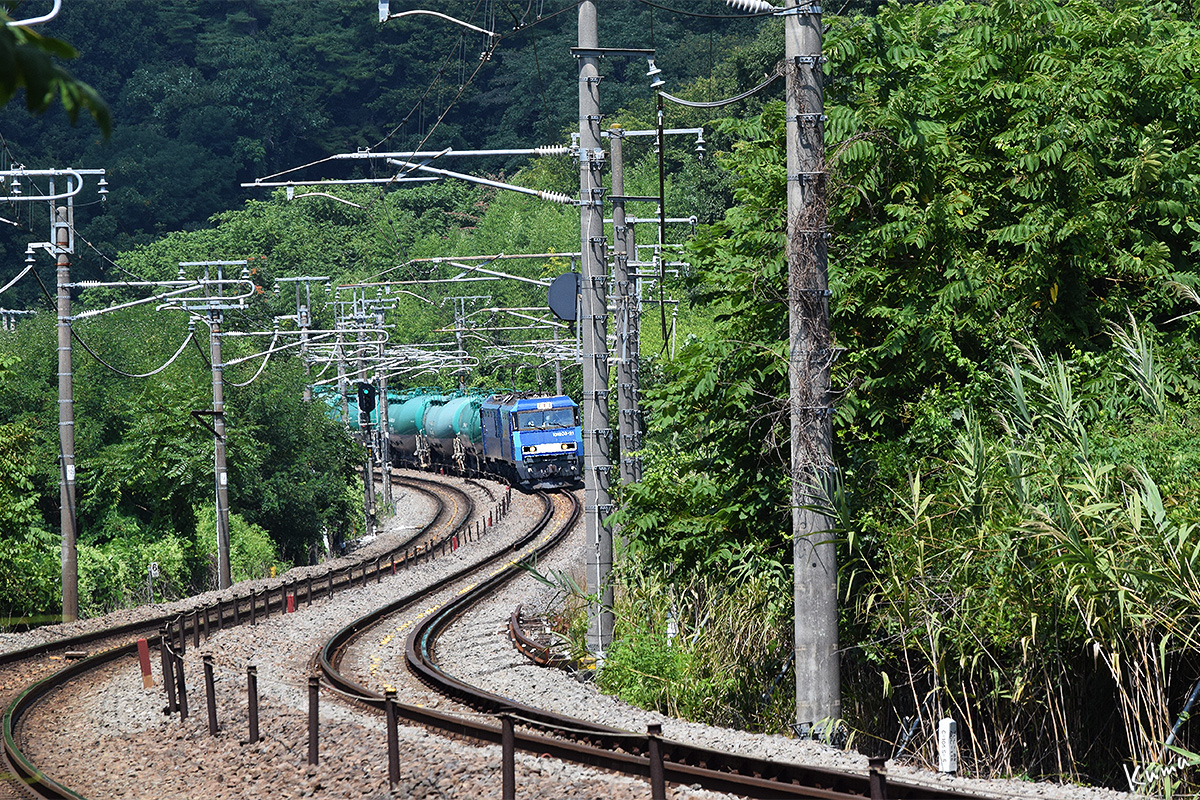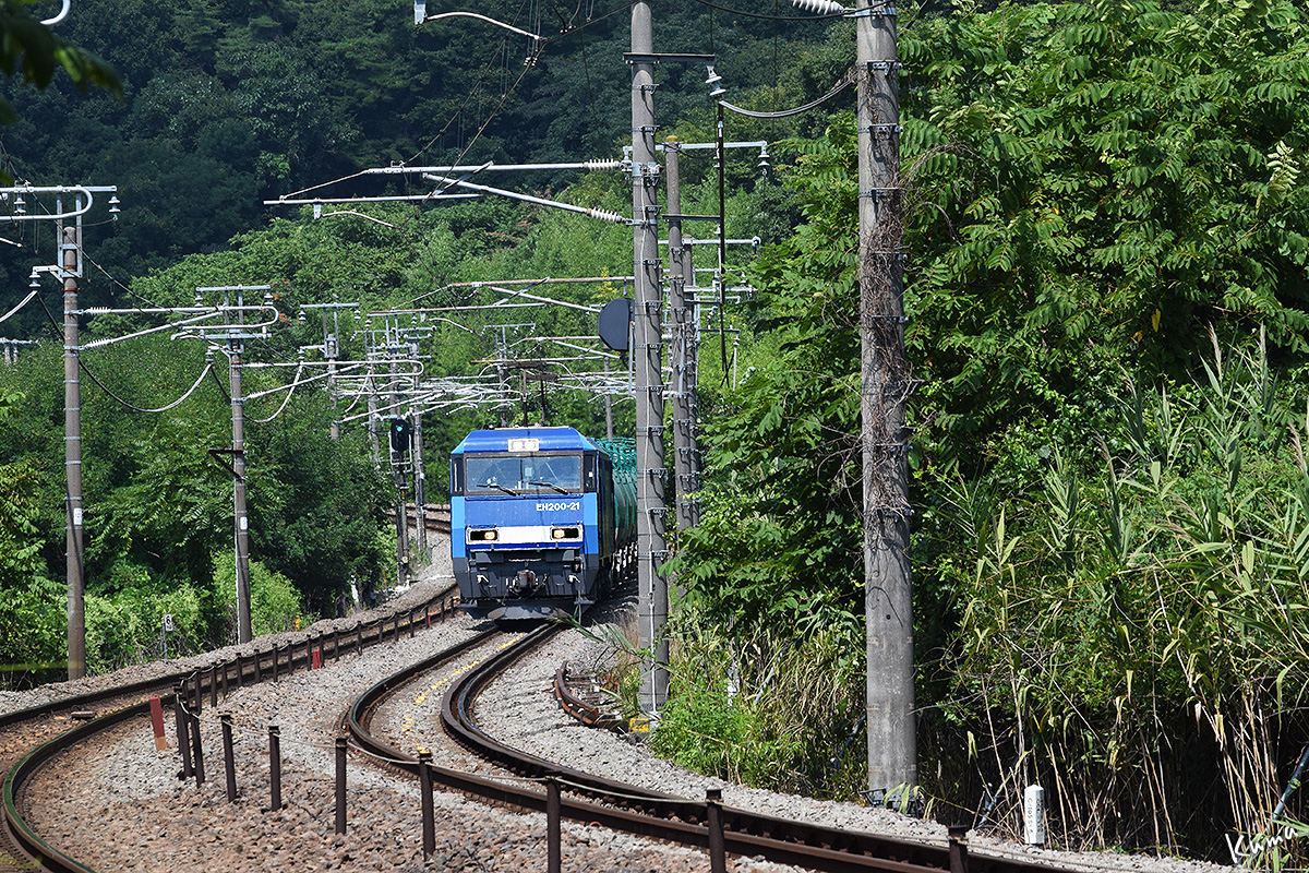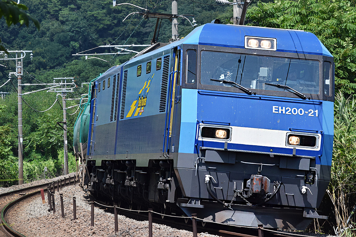 投稿日: 2025年9月26日2025年9月25日 投稿者: くまぱぱS字カーブの石油列車 「S字カーブのコンテナ列車」と同じ場所。 コンテナ列車は下りだったが、今回は上りだ。 機関車は同じEH200で、今回は21号機だ。 コンテナ列車のときよりズームアップしている。 正面から向かってくる姿は、やはり迫力がある。
