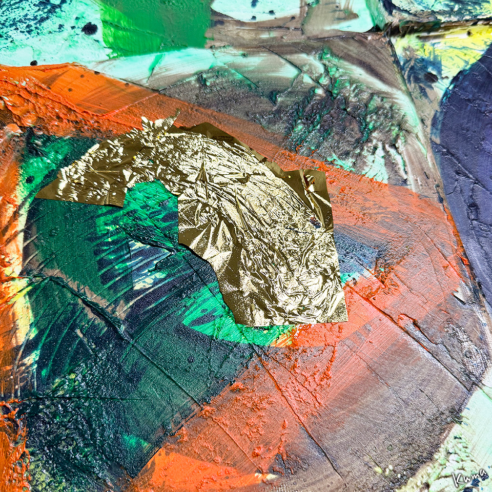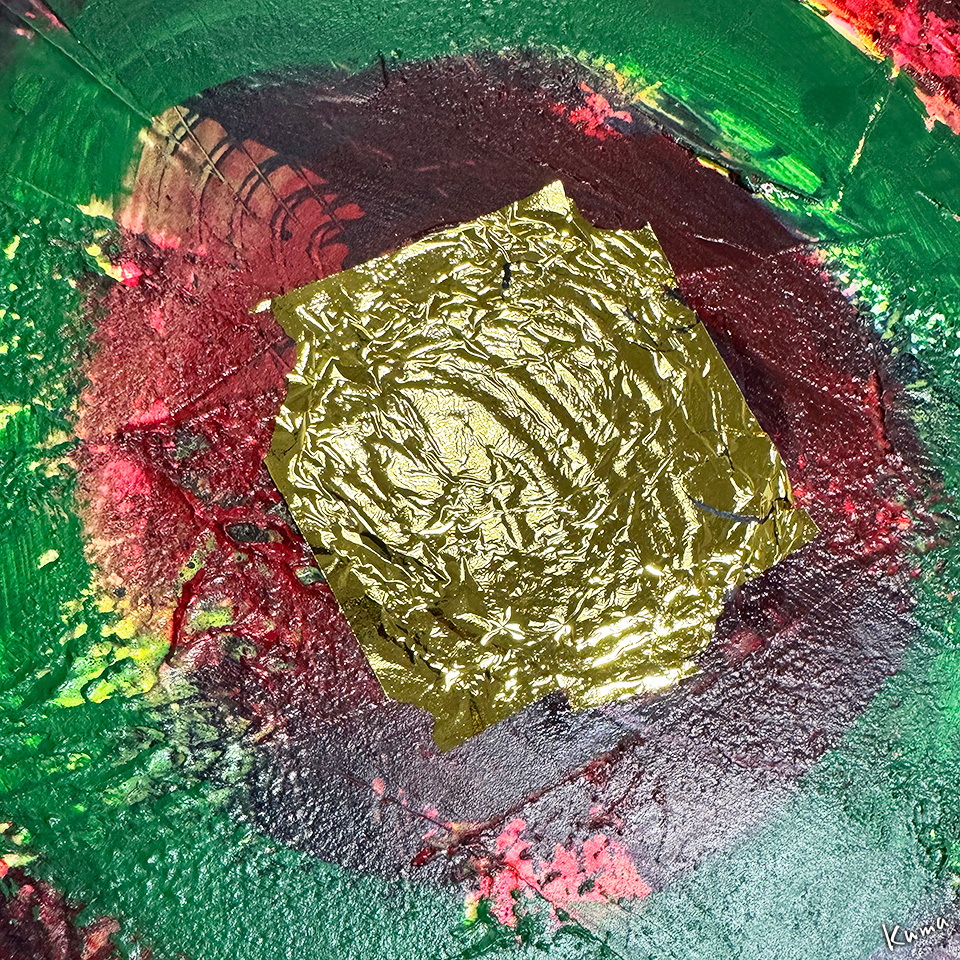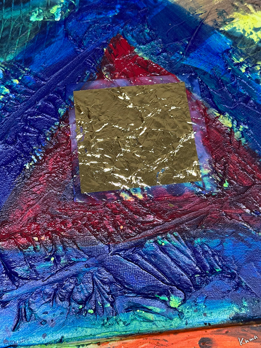 接着剤のない部分まで金箔がはみ出している。