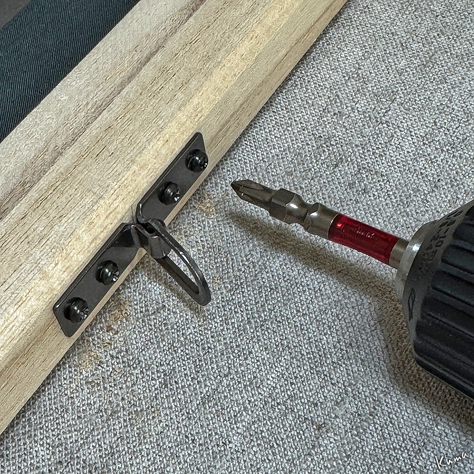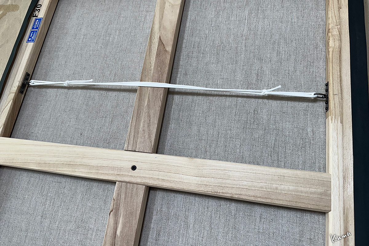 額縁がないので展示用の金具はキャンバスのヘリに取り付ける。F30号というサイズなので金具も重さに耐えられるやや大型のものだ。