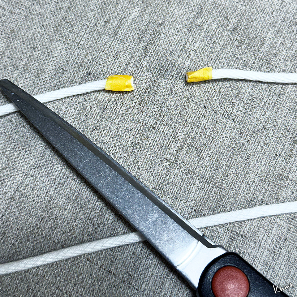 紐はポリエステル金剛打の3mm太さ。紐を切るときはマステを巻いてハサミで切る。ほつれないようにするためだ。