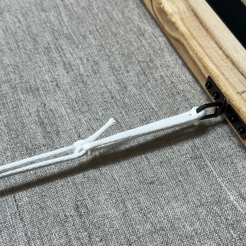 金具にこのようにかけて結ぶ。緩んで伸びないようにピンと張ってしっかり結ぶ。緩むと展示の位置合わせが難しくなる。