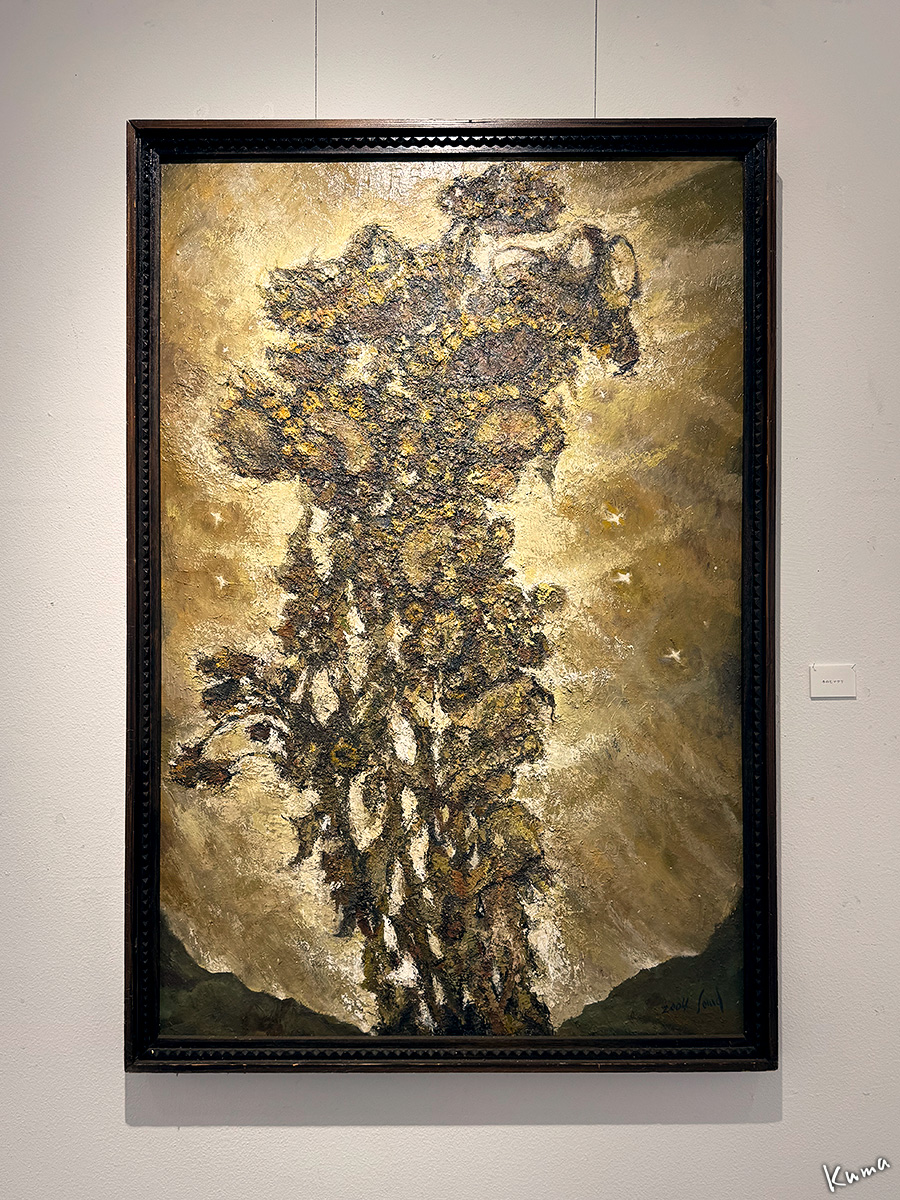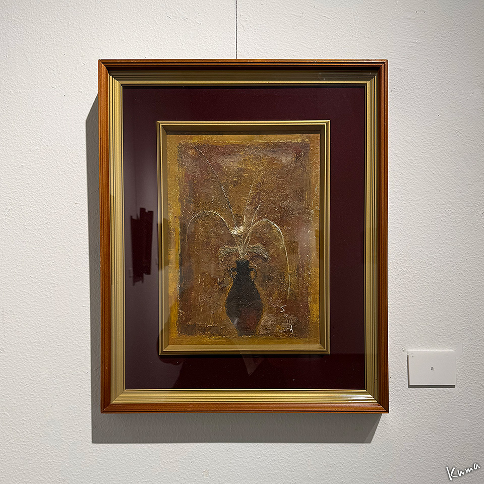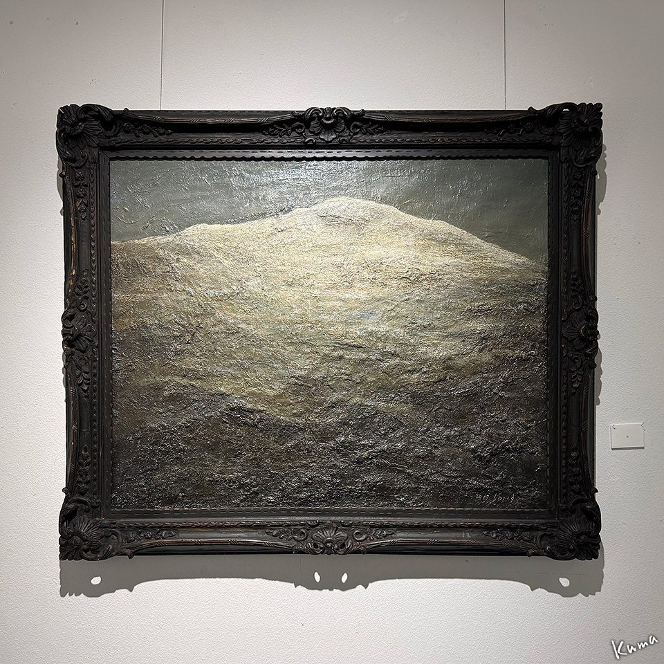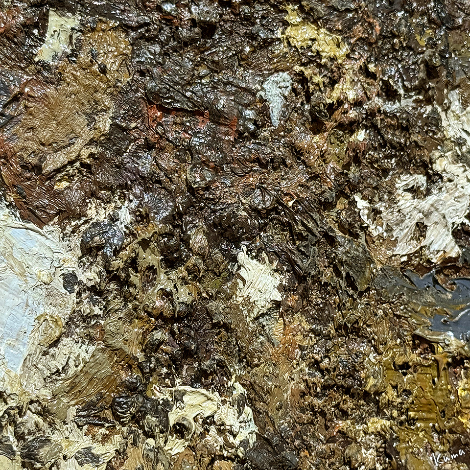 投稿日: 2025年10月25日2025年10月24日 投稿者: くまぱぱ遠い風の旋律 杣雅司展 2 「遠い風の旋律 杣雅司展 1」の続き。 まるで祭壇のように構成された展示。 「山」 重厚なマチエールが重々しく神聖な感じを出している。 「花」 輝くような深さのある小品。 「冬のヒマワリ」 枯れた中の色彩が美しい輝くような作品。 上の作品の部分アップ。 油絵の具の一筆一筆が独特のマチエールを作っている。 次回に続く。