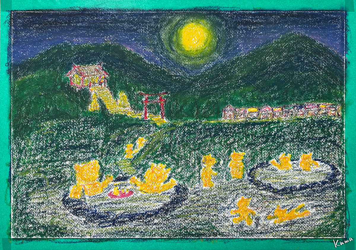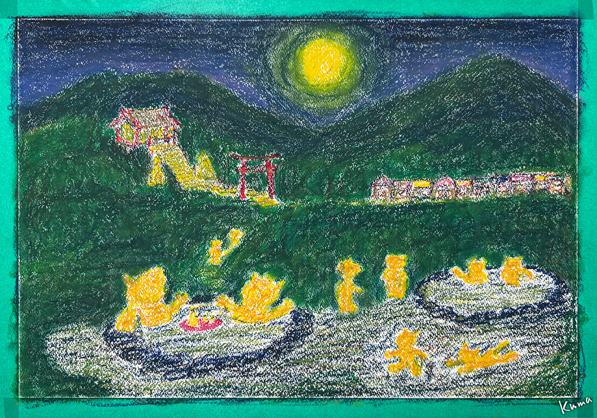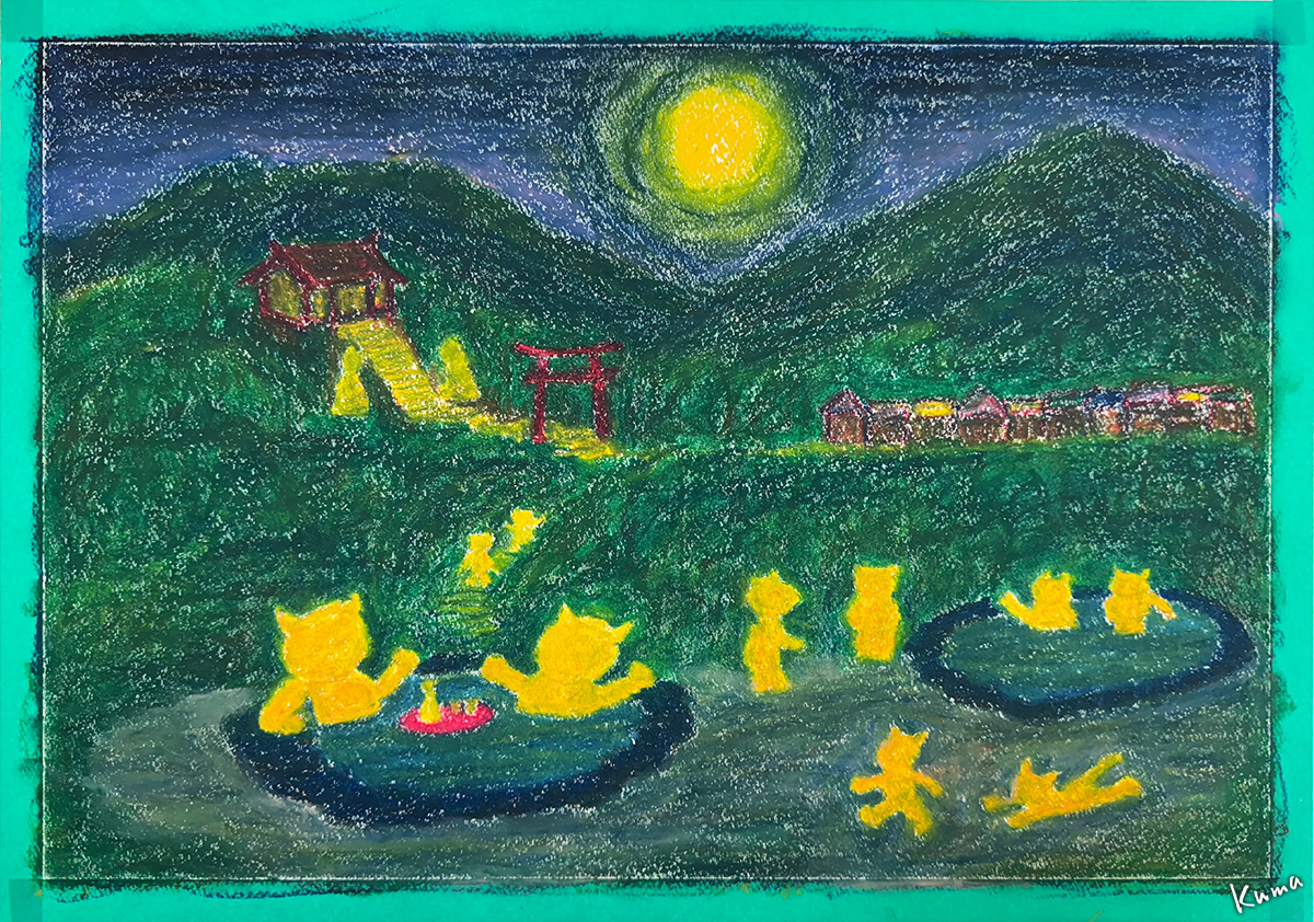 神社や門前市の土産店、温泉に入る猫又たちなど、細部は指では無理なので綿棒を使う。おかげで少し指の養生ができる。(笑
