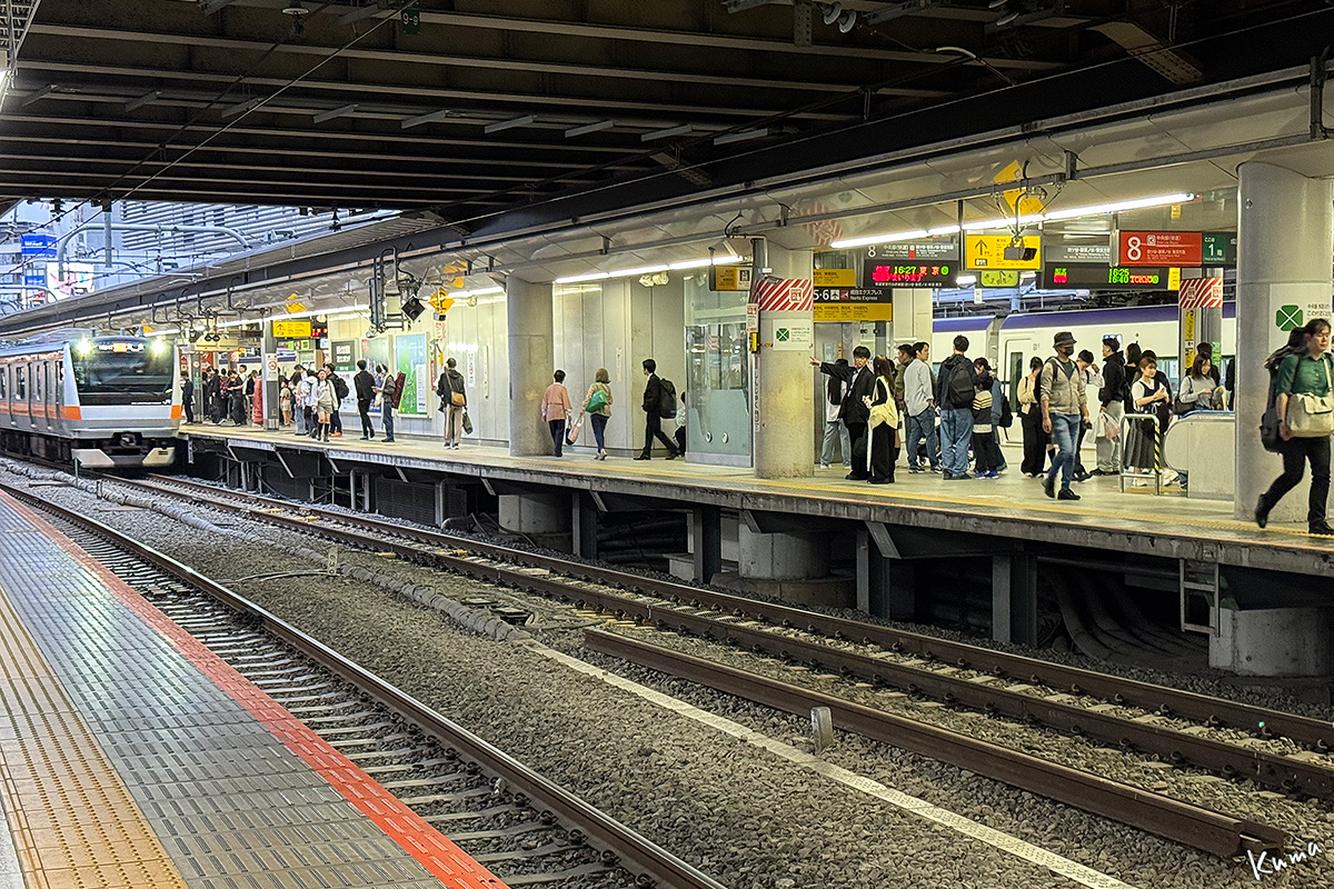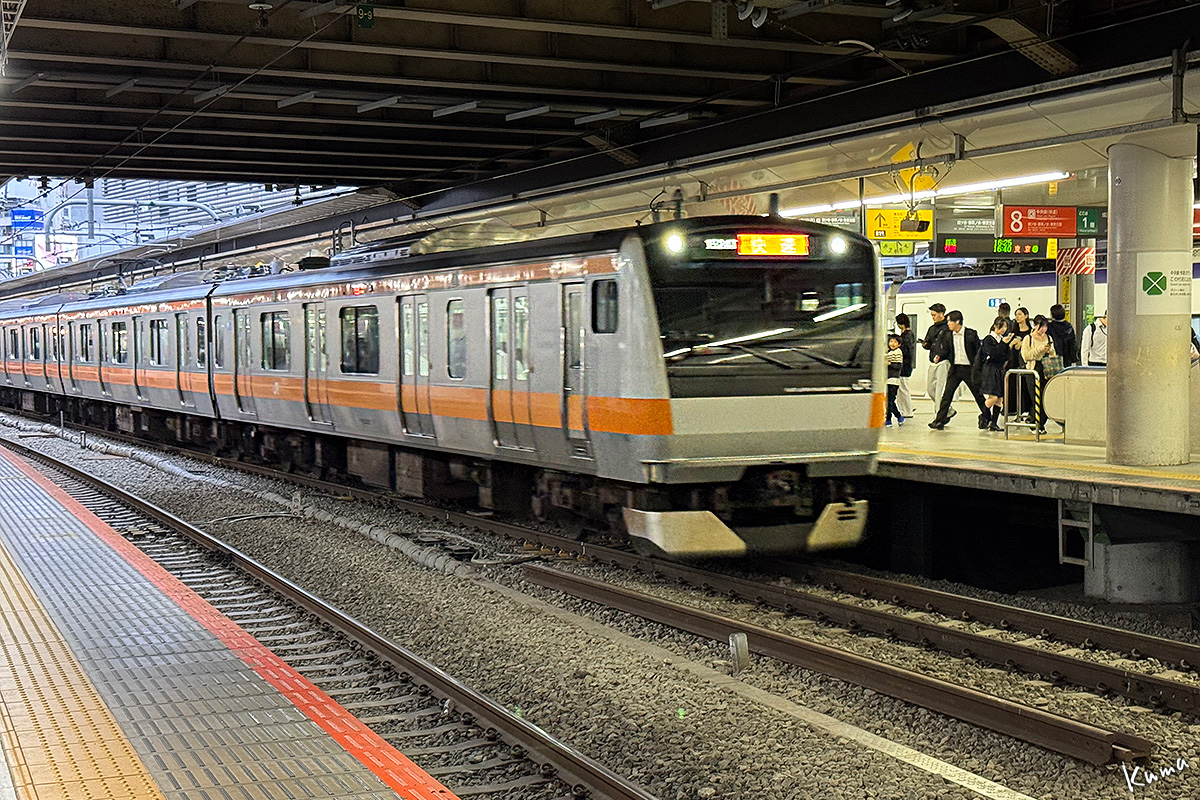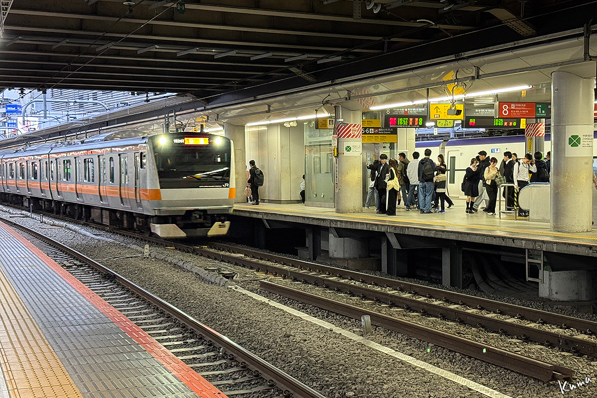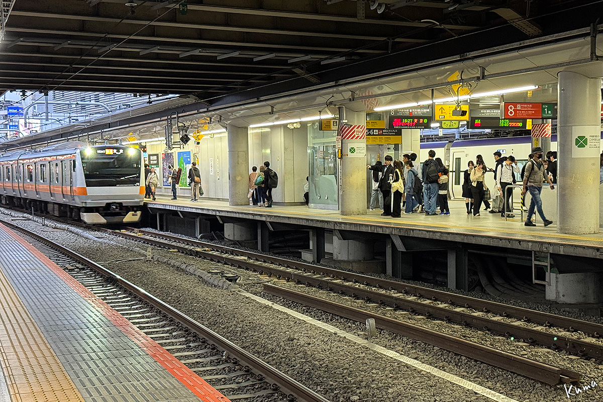 投稿日: 2025年11月7日2025年11月6日 投稿者: くまぱぱ新宿駅の中央線快速 新宿駅8番線に列車が入ってくる。 山梨からの私の目には結構人が多く見える。 まあ、新宿駅としては空いているのだろう。 列車はE233系12両編成。 大月駅より西側には走っていないので、私としては見る機会の少ない車両だ。