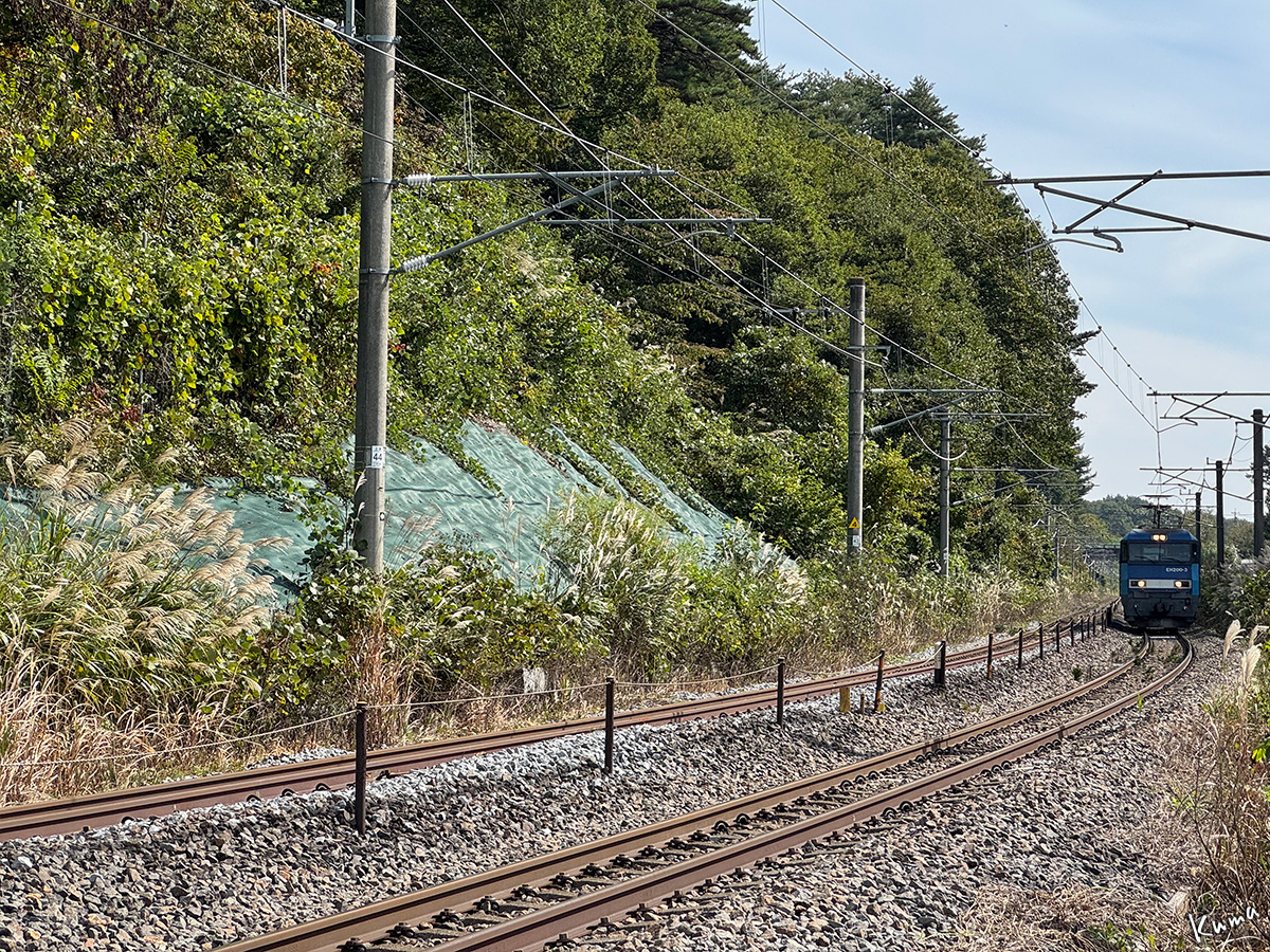 投稿日: 2025年11月14日2025年11月13日 投稿者: くまぱぱEH200 単機回送 遠くから貨物列車がやってくる。 ここは列車を正面から撮影できる数少ないポイントの一つ。 だが、いつもの貨物列車に比べて走行音が小さいようだ。 おや。電気機関車の後ろに貨車が連結されていない。 何と、EH200-3号機の単機回送だった。 通常なら、コンテナ列車が走る時刻だが、この日は貨物が少なすぎて運行中止になったらしい。 とは言っても、南松本の貨物基地にある空車などを回収しないわけには行かないし、その他の運用の都合もあるので、通常の貨物列車のダイヤで機関車だけを単機で回送したらしい。