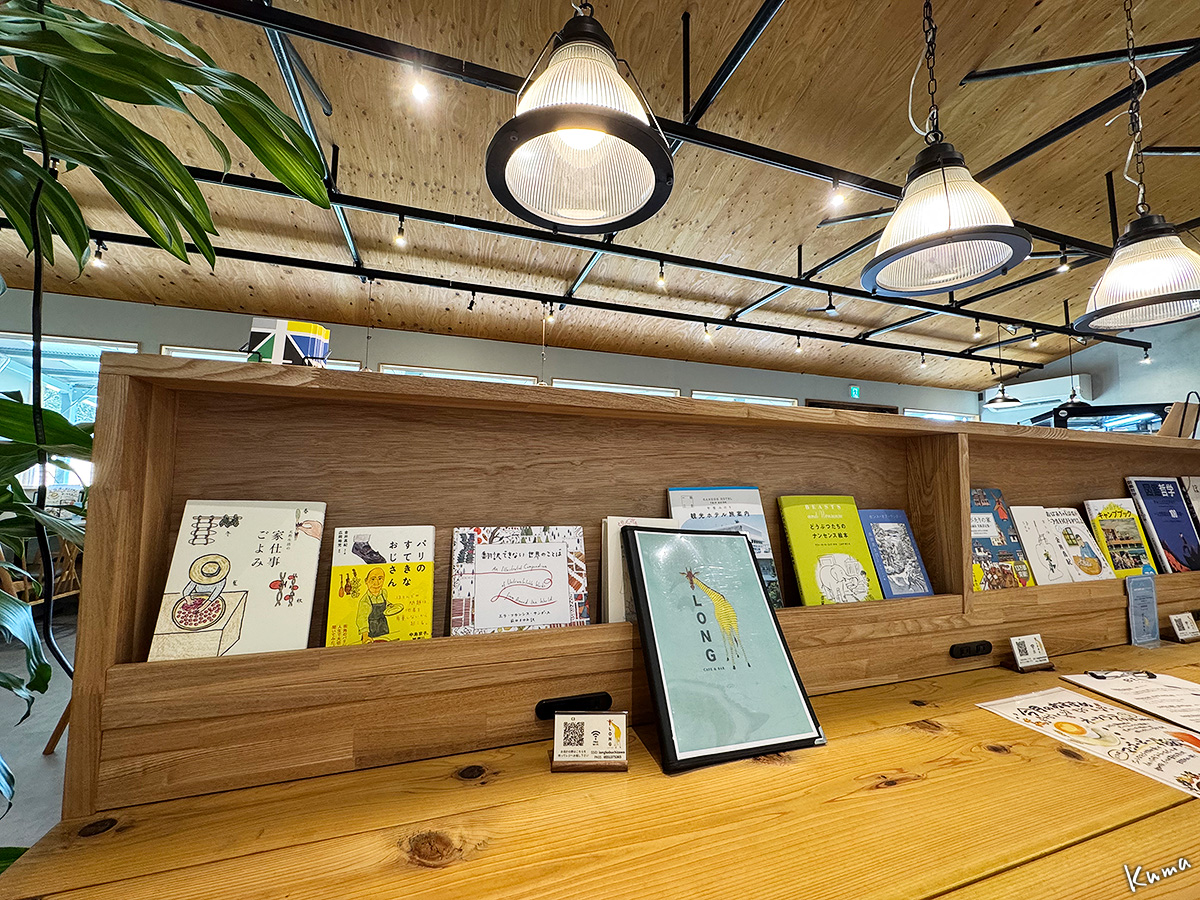 広くて明るくとてもいい感じの店内。カウンター式のテーブルにはちょっと興味を引く本が用意されている。