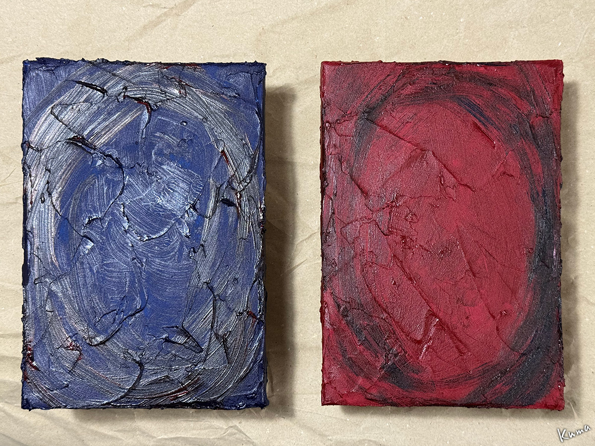 絵の具はアクリル。赤系と青系の2枚同時進行で行く。あまり明るくなりすぎないように、どちらもダークな色を選んだ。