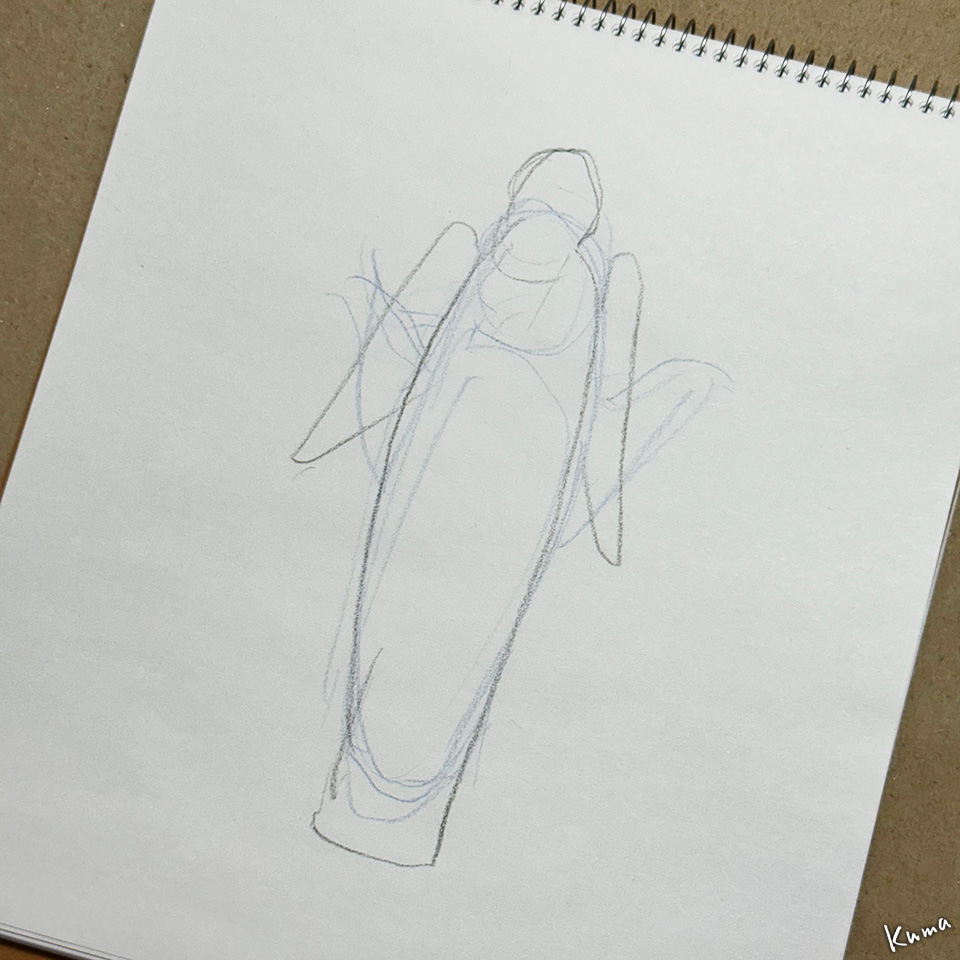 ここに描くのは人物の予定だが、ちょっと抽象的で幻想的な人物・・聖人とか怪人とか・・天使でもいいかな? のスケッチ。