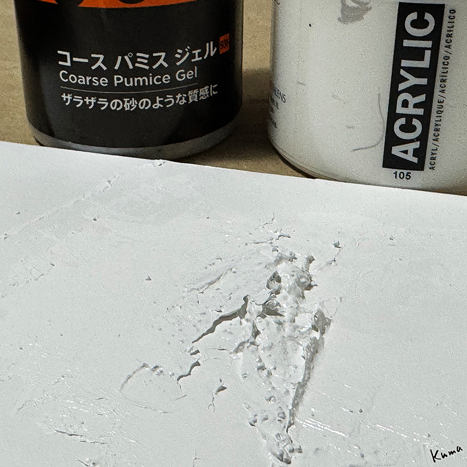あまり現実感のない人物にしたいので、ざらついた質感にしようと思い、アクリル絵の具の白にコースパミスジェルを混ぜてみた。