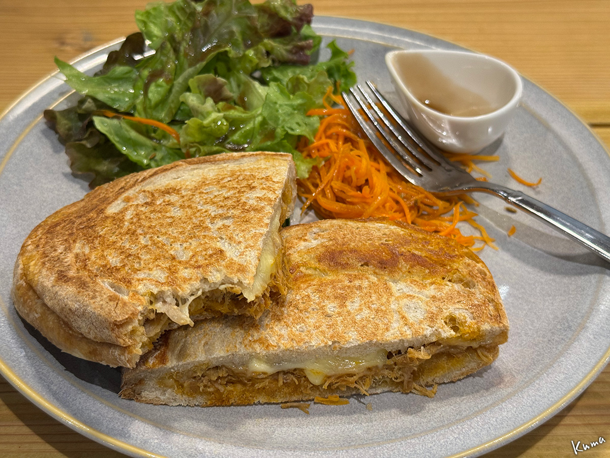 プルドポークとチーズのホットサンド。プルドポークとは、豚肉の塊を低温で加熱し、フォークなどで細かく裂いた状態にした料理。