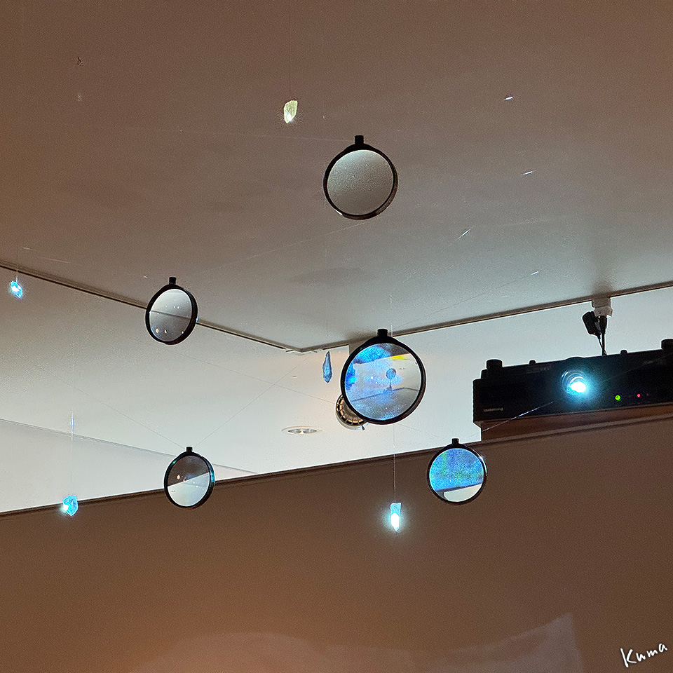 レンズは画面に影となっている。クリスタルは揺れると時々光を放つ。