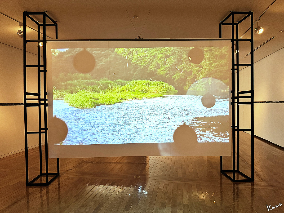プロジェクターの下から見ると、対面のスクリーンに川の流れる風景の動画が映し出されている。