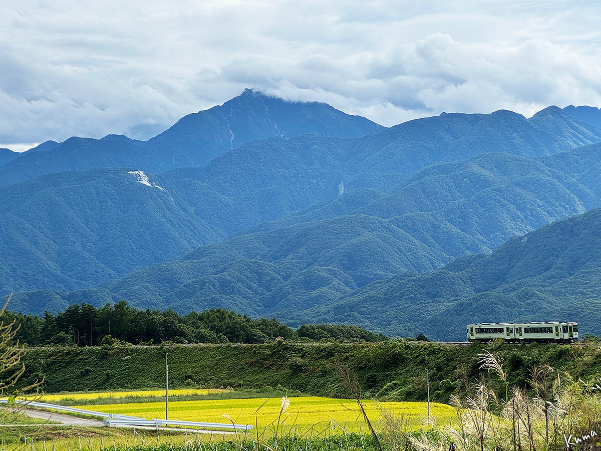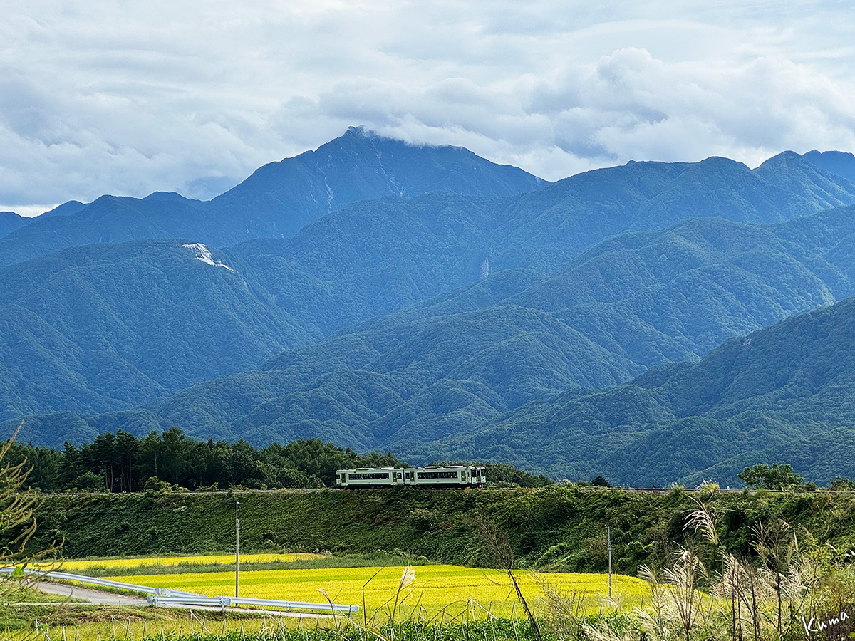 投稿日: 2025年11月28日2025年11月27日 投稿者: くまぱぱ10月の大曲り 何故か機会を逸してアップしていなかった先月の写真。 山頂に少し雲がかかった甲斐駒ヶ岳。 手前には刈り入れ前の水田。 小海線の普通列車。キハ111と112の2両編成だ。 半径300m、勾配25‰の大築堤を上ってくる。