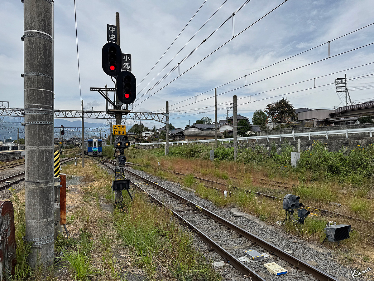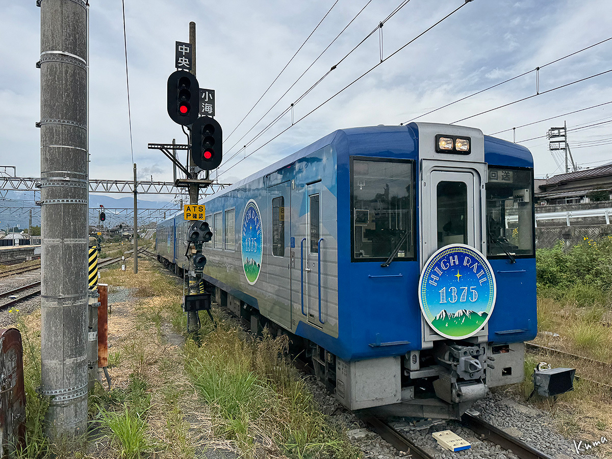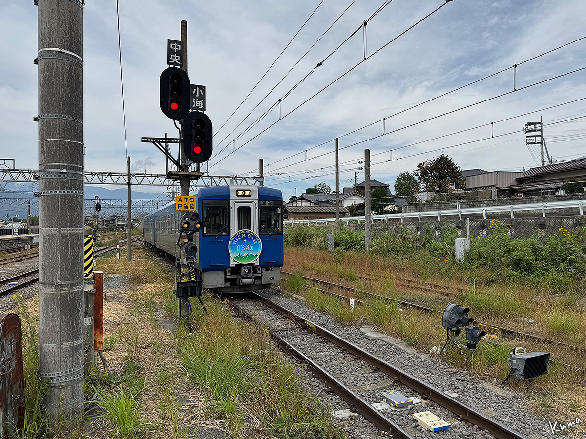 投稿日: 2025年11月30日2025年11月29日 投稿者: くまぱぱハイレール1375 回送 観光特別列車の回送が小淵沢駅に入ってくる。 正面の形は普通列車のキハ110系と変わらない。 ただし色が違うのでイメージは大きく変わってくる。 丸いヘッドマークもいい感じだ。 この列車は10:39発のハイレール1号小諸行きとなる。