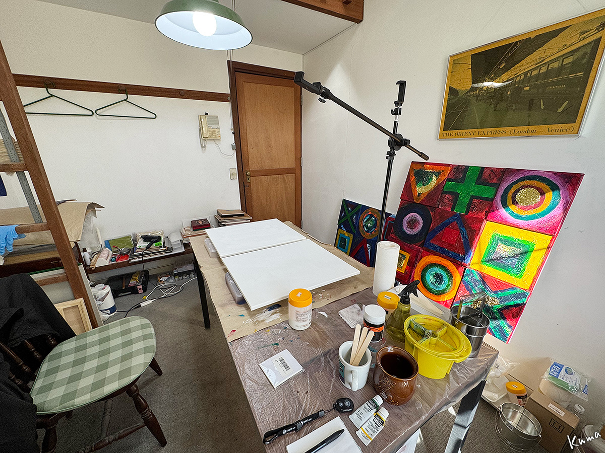 私は元々グラフィックデザインをやっていたので、水平のテーブルの上で制作する方が慣れているので、こんな感じのアトリエにしている。