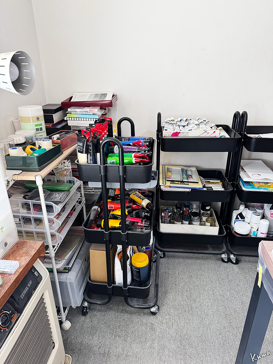 絵の具や道具類はキャスター付きのワゴンに収納。制作内容によって使いやすい位置に移動する。