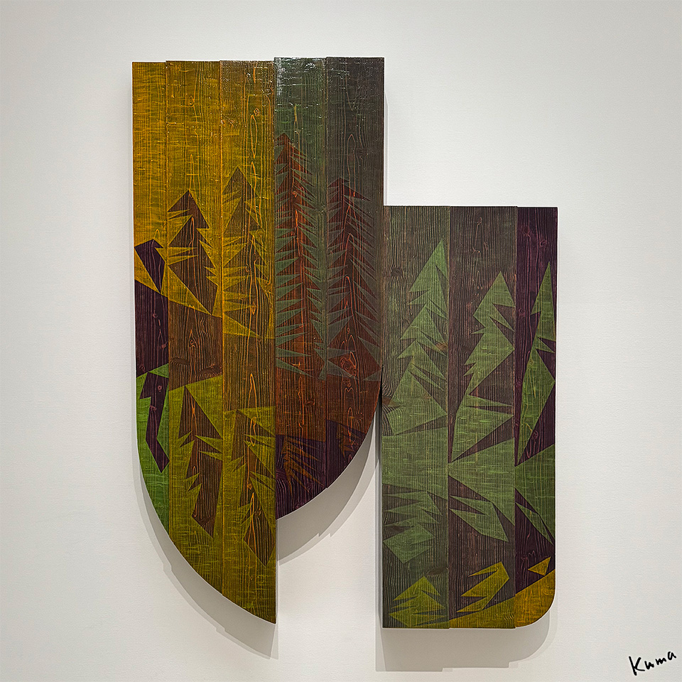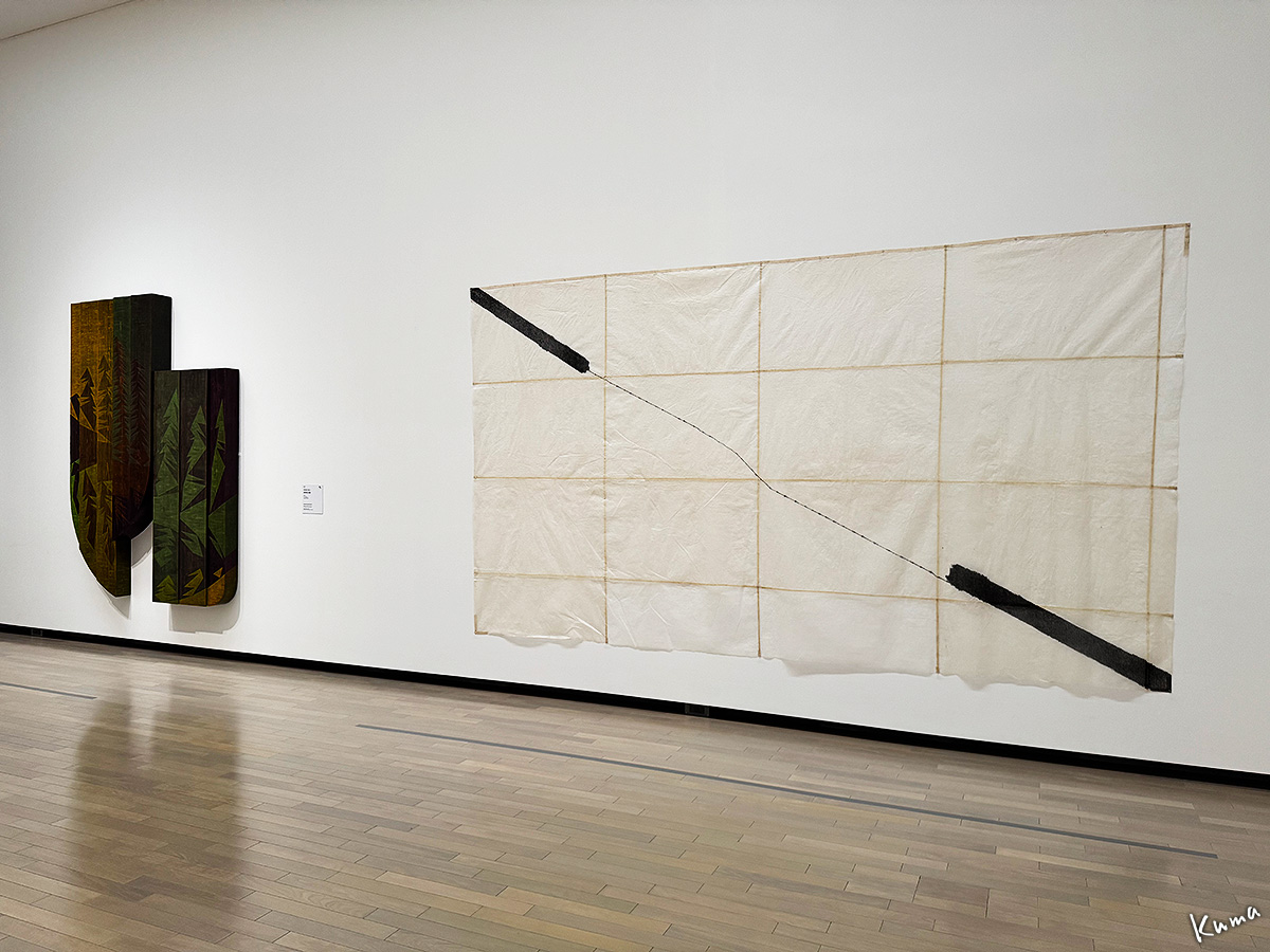 右の作品は失念してデータがない。杭に鉄条網が張られているような、南北朝鮮半島の分断を表しているのか?