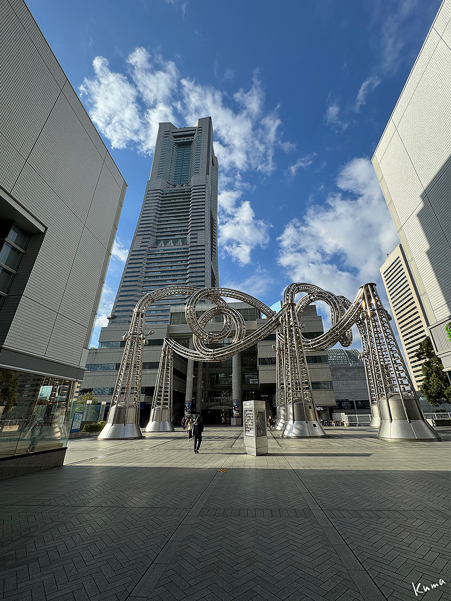 横浜ランドマークタワーが聳える。手前は「モクモク ワクワク ヨコハマ ヨーヨー」という最上壽之さん作の巨大オブジェ。