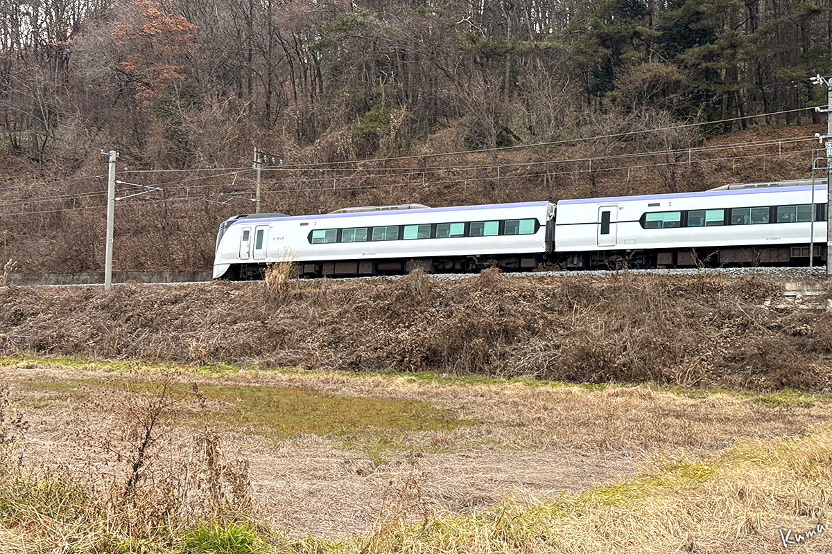 投稿日: 2025年12月24日2025年12月23日 投稿者: くまぱぱ冬の枯野を走る E353系あずさが近づく。 場所はすずらんの里駅ー青柳駅間の長閑な地域だ。 勾配は下り20‰。あずさ号もスピードが乗る。 季節には農作業の人も見かける場所だが・・ 流石にこの時期、列車の他に動くものはない。