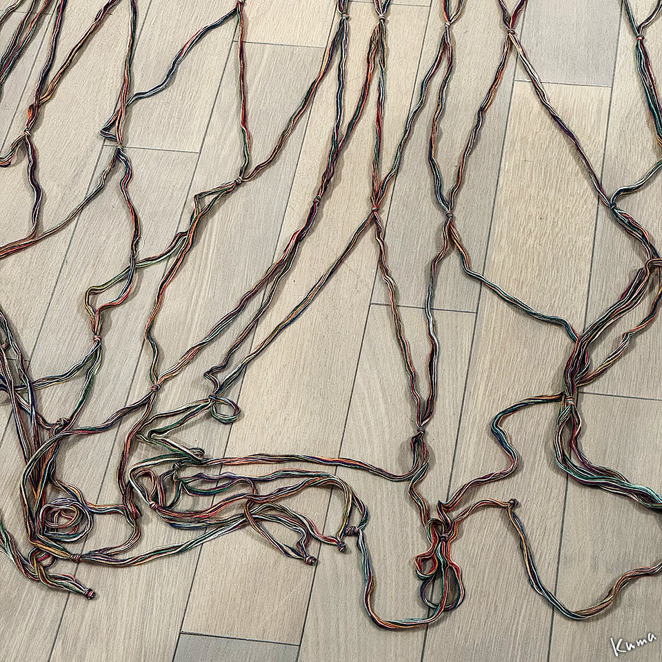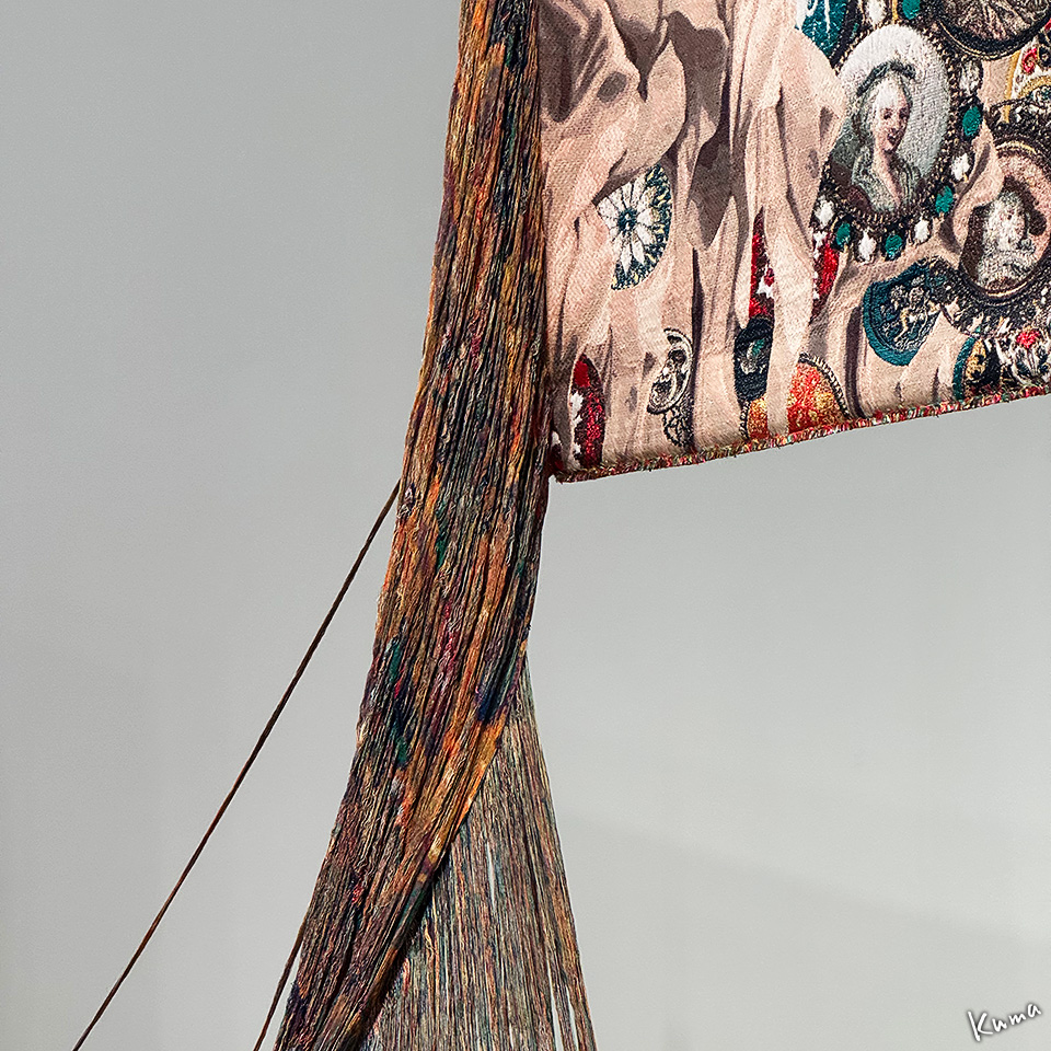 真ん中は布の糸がほどけて垂れ下がり、またそれが絡んで網の様に成っている。異国との繋がりが広がっていくイメージか。