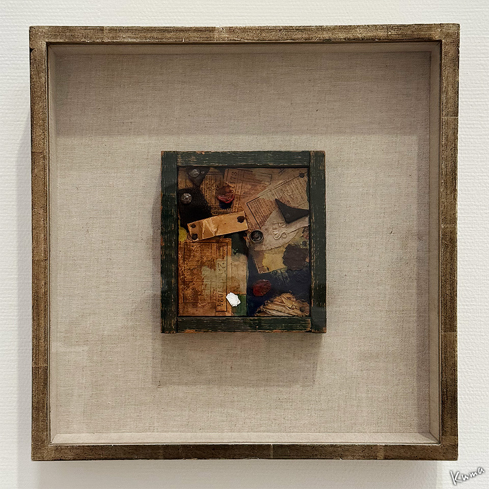 「メルツ絵画1c 二重絵画」 クルト・シュヴィッターズ/作。きっぷや刺繍された布等色々な生活の切れ端を張り合わせた作品は「絵は筆と絵の具で描く」だけでないということを、既に100年以上前に実験していた。