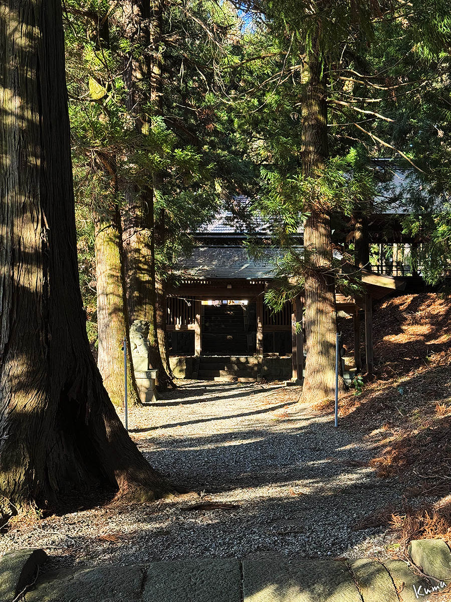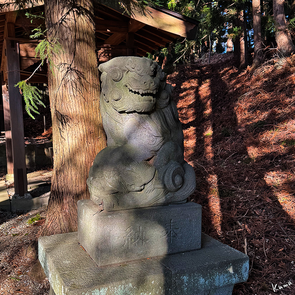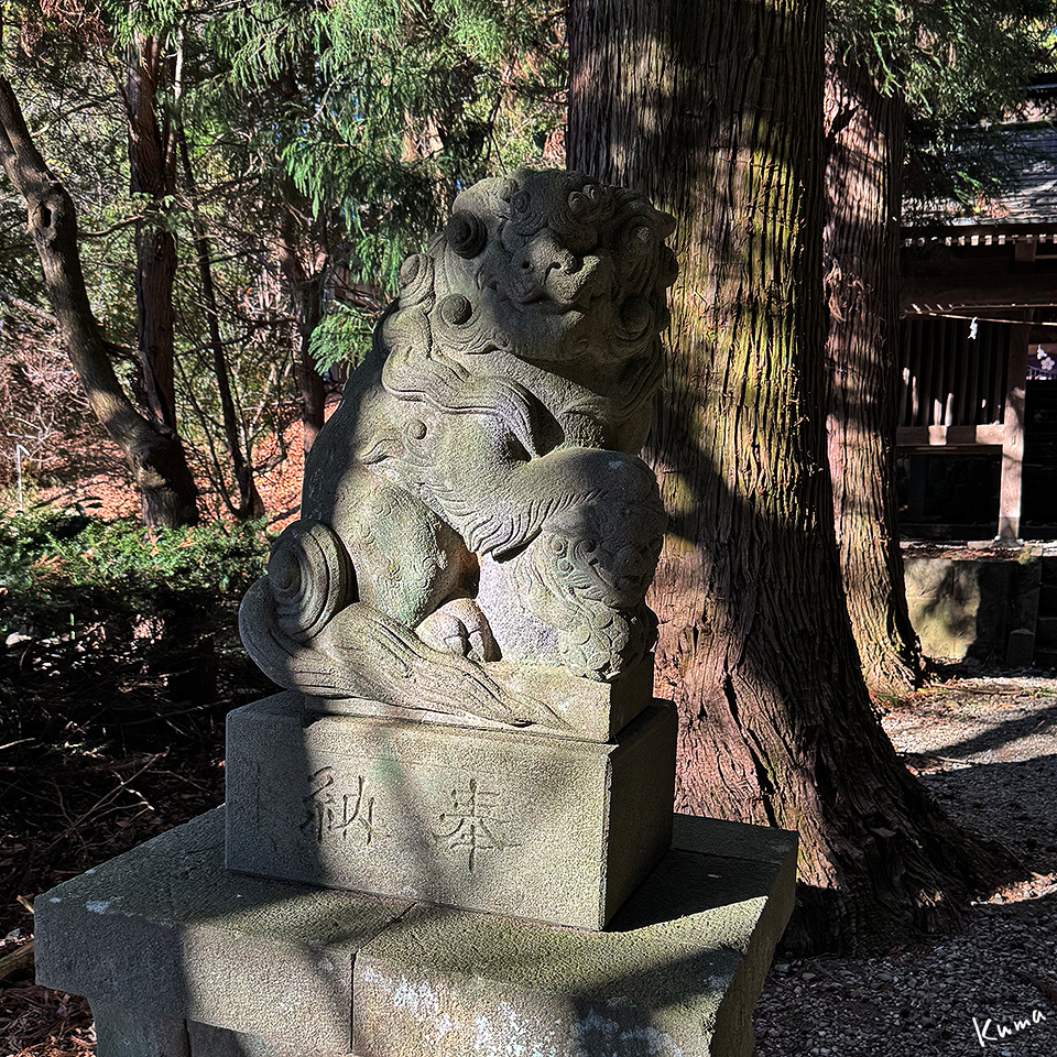 投稿日: 2025年12月30日2025年12月29日 投稿者: くまぱぱ北野天神社 1 小淵沢にある神社。 西暦915年、天神森というところに日本武尊を祀ったのが始まり。 987年、京都北野天満宮から菅原道真公の分霊を勧請合祀し、北野天神社となった。鎮守の森に参道が続く。 杉の大樹の間にご神門が見えてくる。 まさに御神域という雰囲気が漂っている。。 ご神門の前に狛犬がある。 これは向かって右にある阿形の狛犬で、小鬼を抑え込んでいる。 こちらは吽形の狛犬。 鞠で遊ぶ子犬の頭を撫でている。 次回に続く。