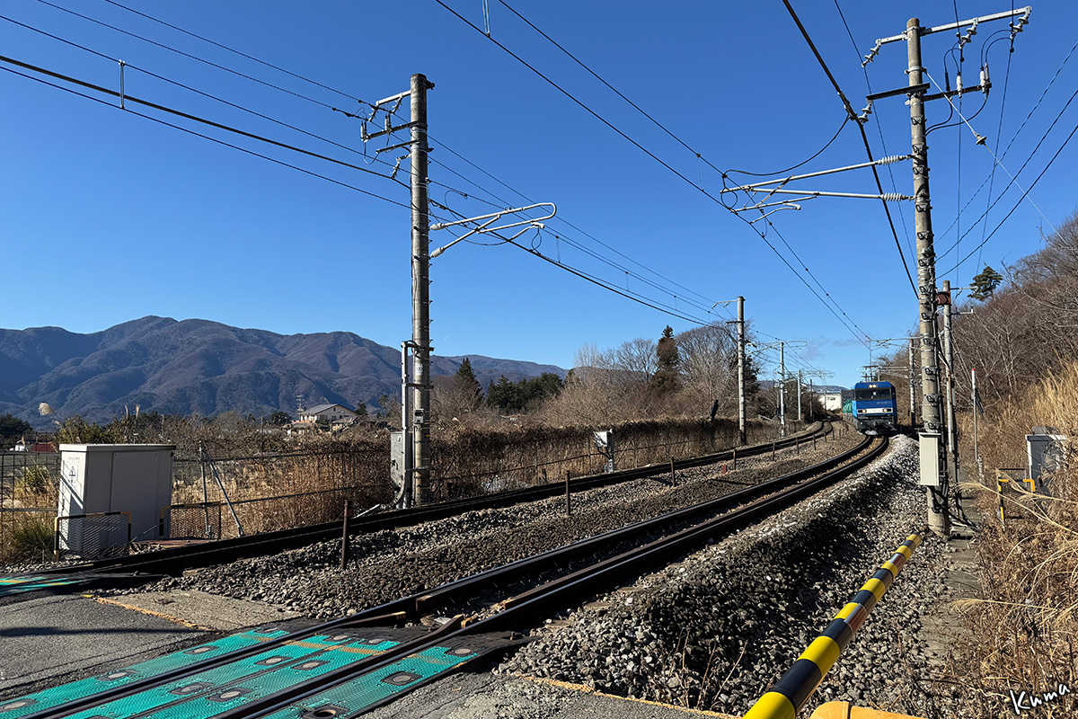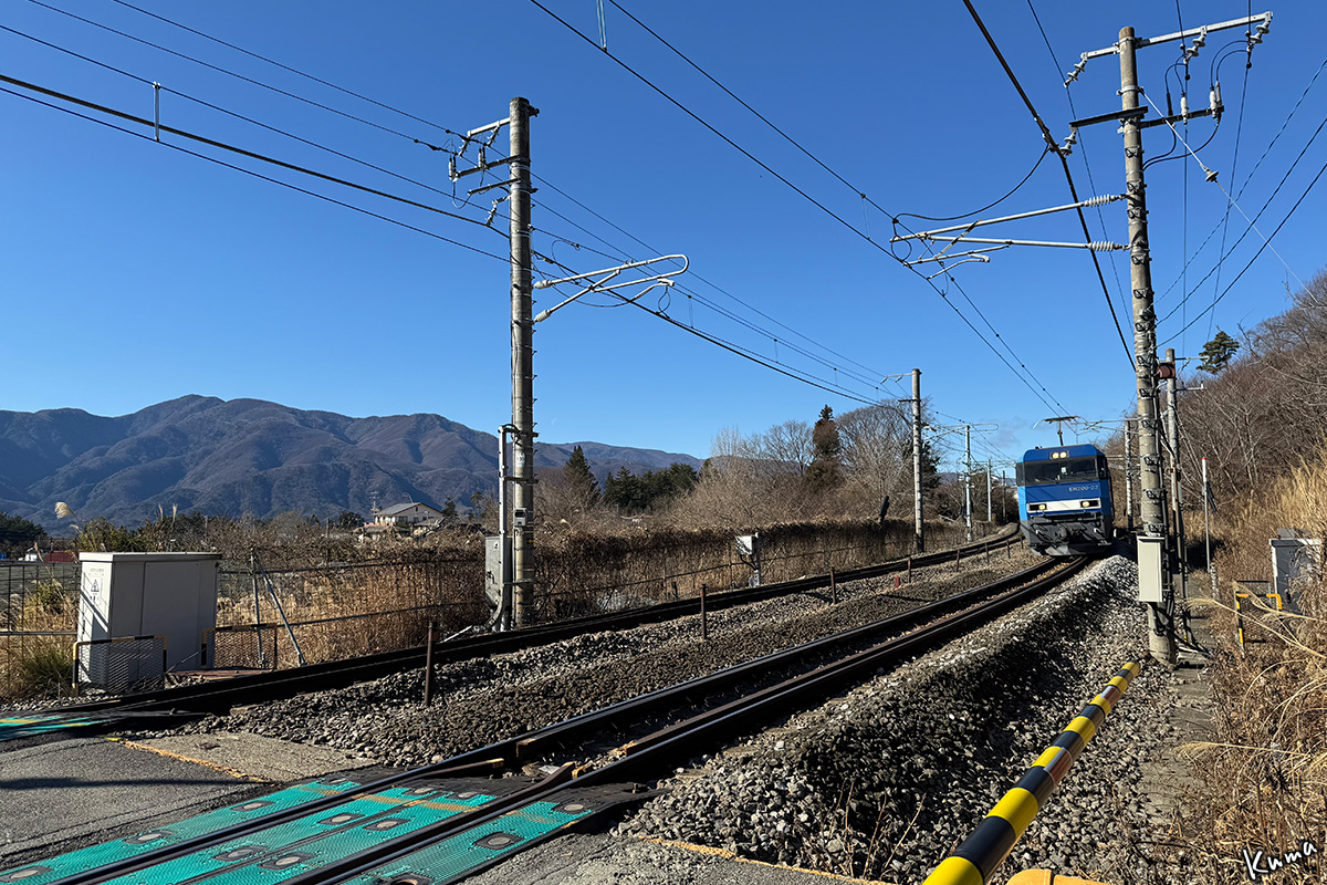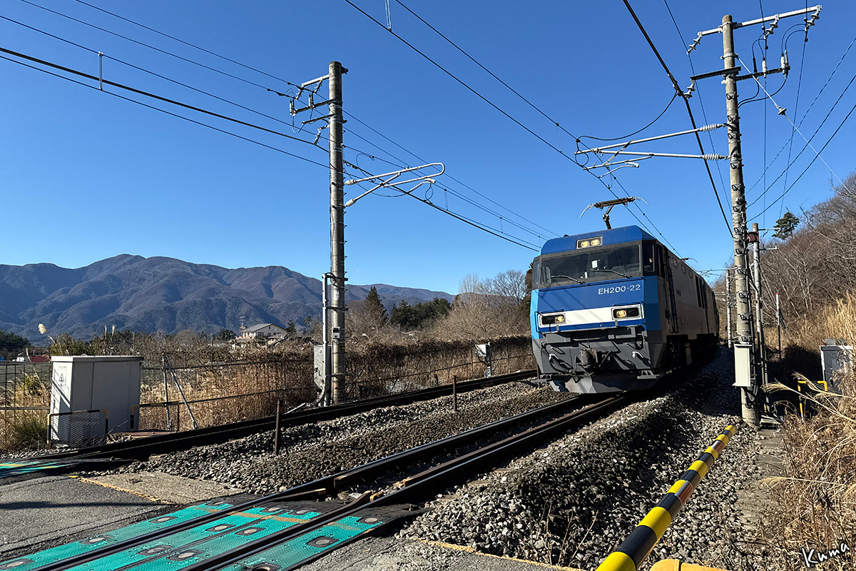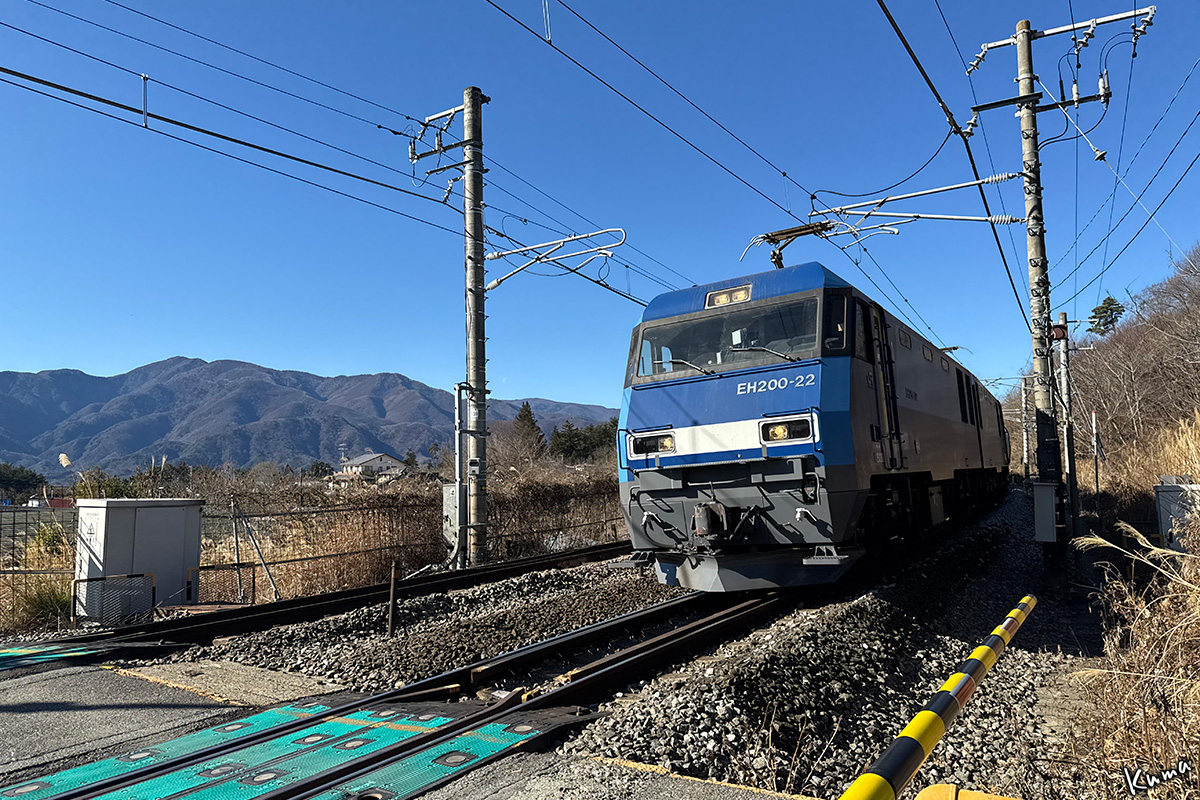 投稿日: 2025年12月31日2025年12月30日 投稿者: くまぱぱ青空の下 貨物列車が走ってくる。 電気機関車EH200が牽く高速石油列車だ。 暫定税率が廃止になったガソリン輸送。 今日の牽引機は22号機。 年末だからといって休む暇はない。