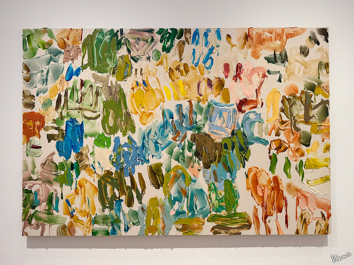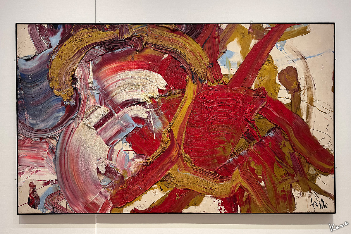 「梁山伯」白髪一雄。例の、天井から縄でぶら下がって、キャンバスに盛り上げた絵の具を足でかき回したという作品。