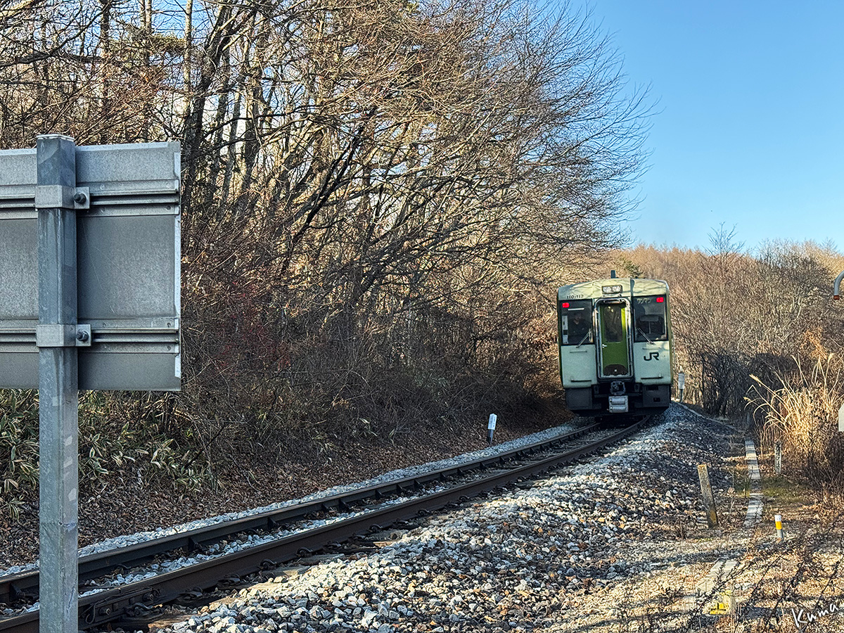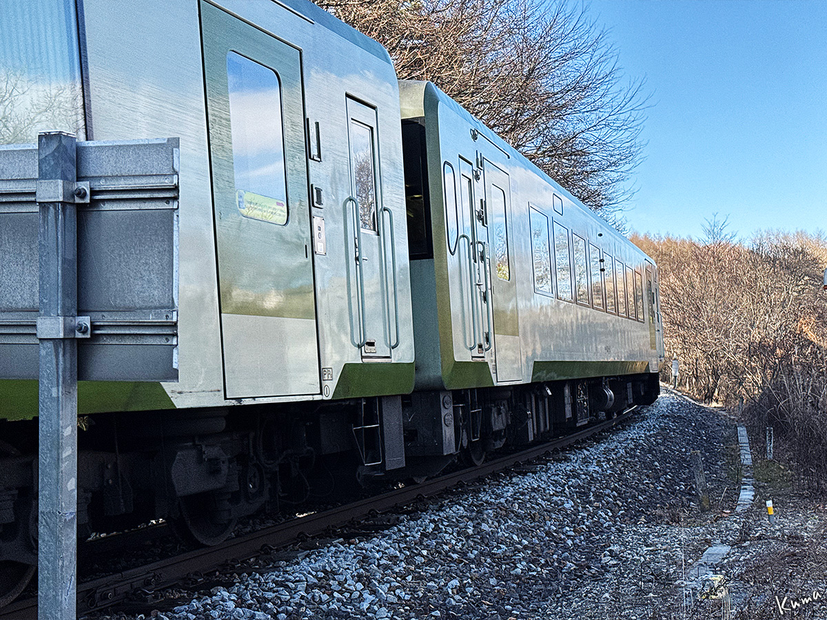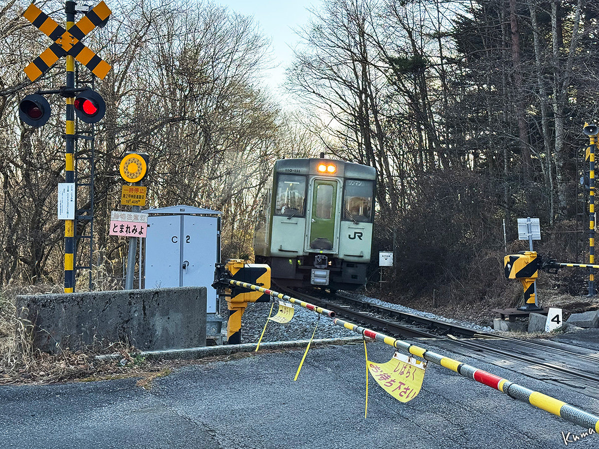 投稿日: 2026年1月7日2026年1月6日 投稿者: くまぱぱ第2甲州街道踏切通過 小海線の下り普通列車が近付く。 ここは第2甲州街道踏切。昔は国道141号線だったところだ。 パイパスが出来てからは通る車もめったに居ない裏道になった。 キハ110の2両編成も、難なく寂しそうに通り過ぎていく。 33パーミルの急登坂区間。 まもなく山梨長野県境を超え、野辺山駅に向かう。