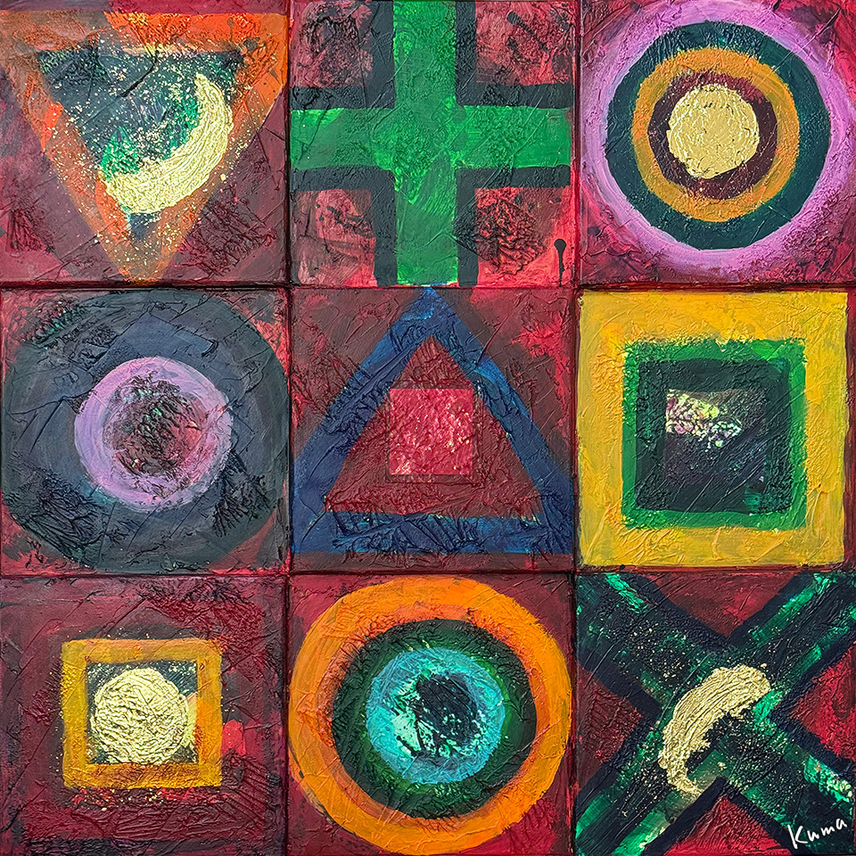 ベースの白を「156」の暗い青に合うよう暗い赤系にしていく。それに合わせて図形も塗り重ねての色合いを変えていく。