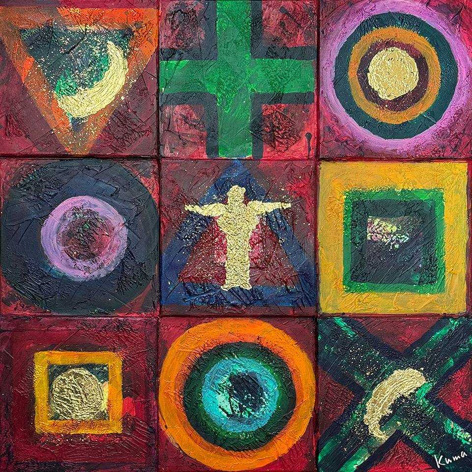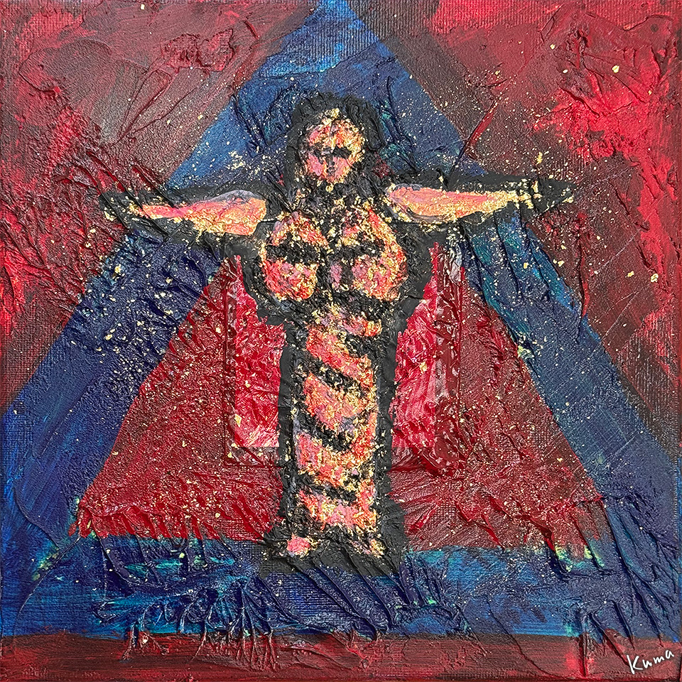 周囲の図形の中の金箔にも赤系のトーンを加えて全体の色調のバランスをとる。天使の輪とサインを入れて完成。