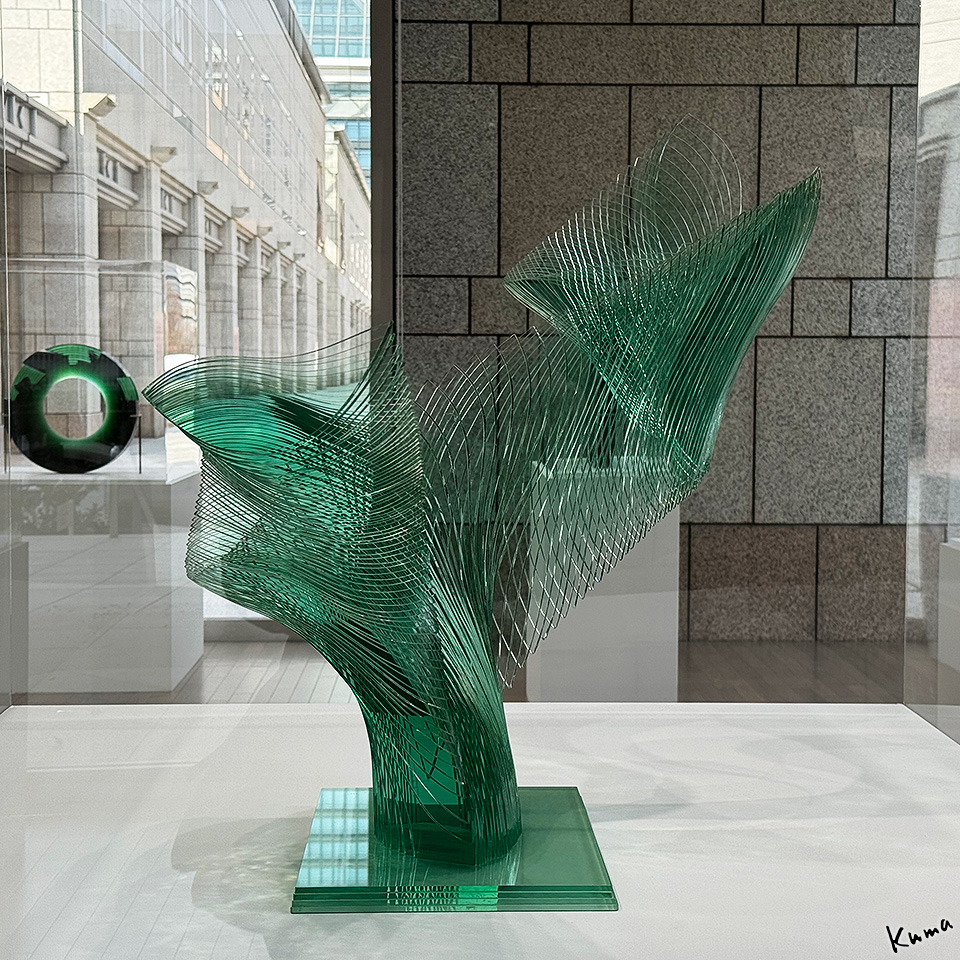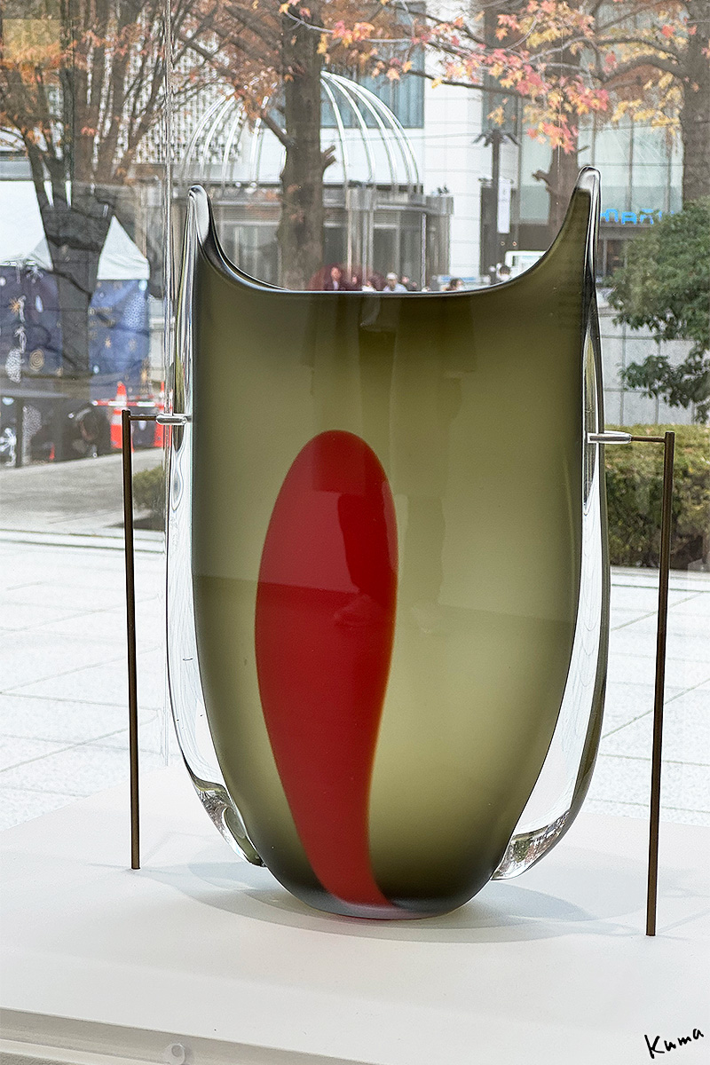 透明ガラスに包まれた赤と、半透明の緑系のグラデーションが美しい。