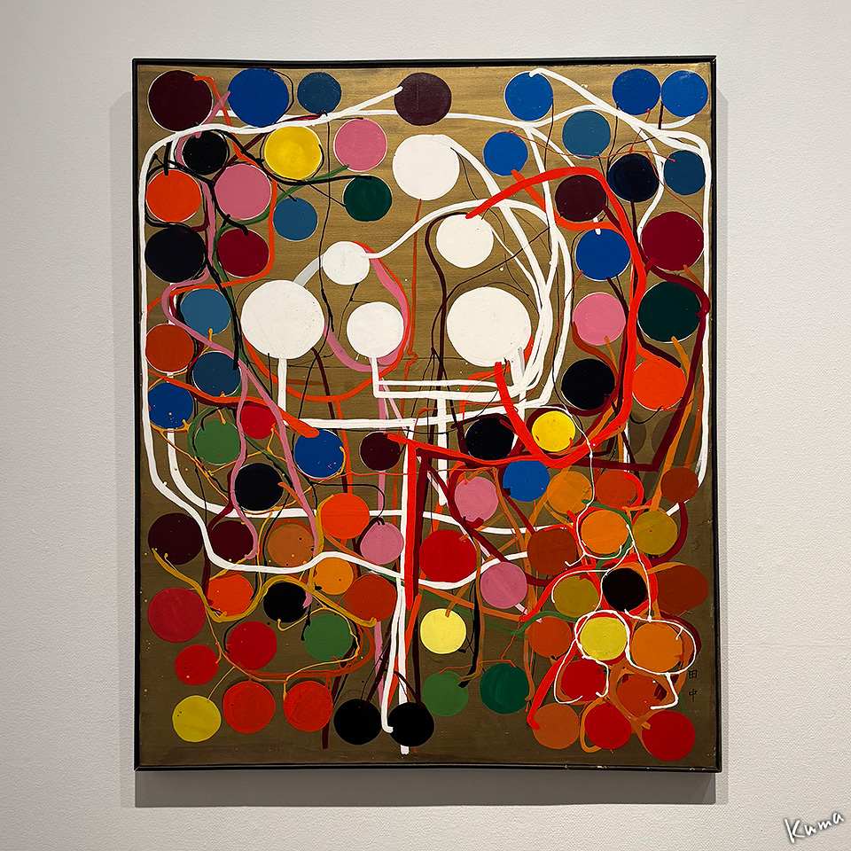 「金のWoak A」田中敦子/1932〜2005。「具体美術協会」に参加。電球とコードによる「電気服」から展開した絵画が高評価。