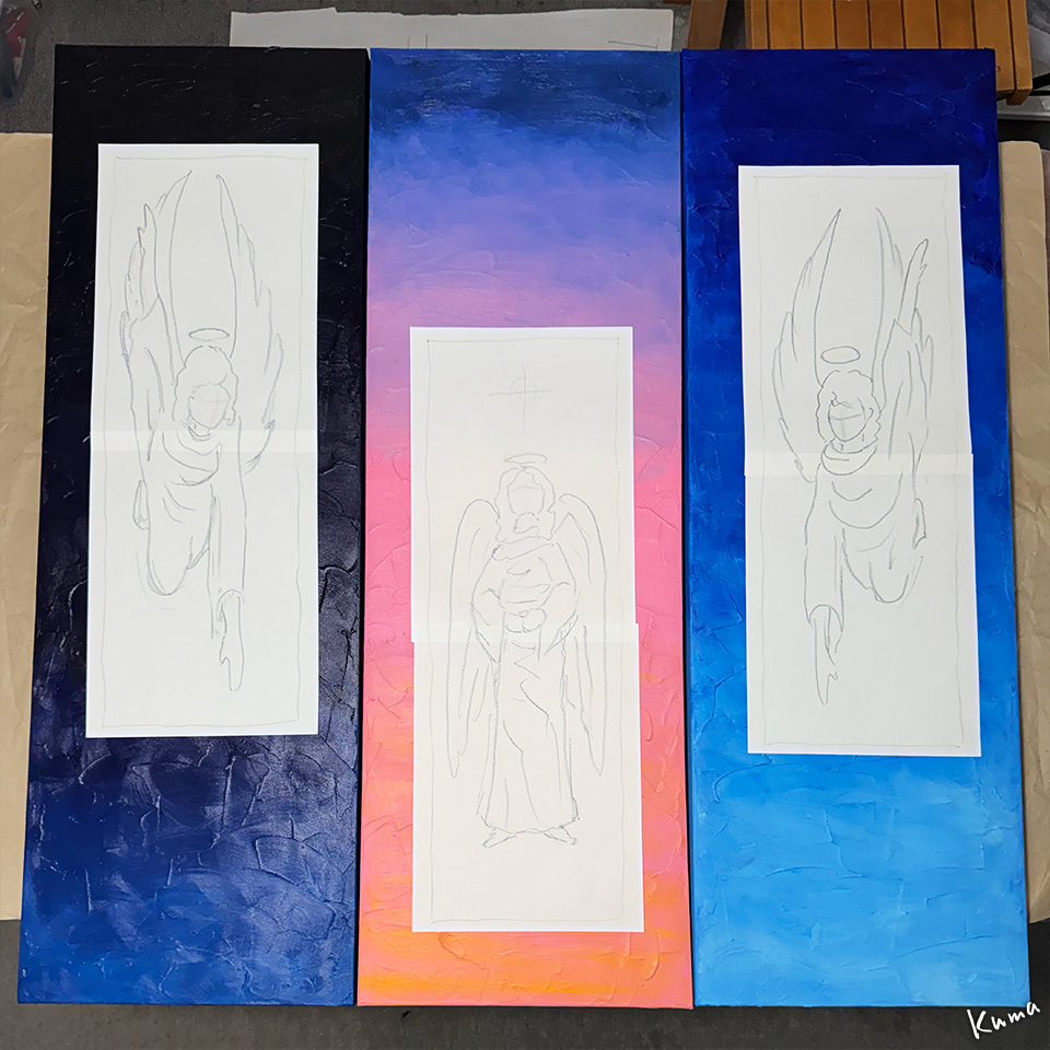 FBの「Todays drawing」のコーナーで描いた天使のラフを拡大して位置をあわせた。ポーズはまだ決まったわけではない。
