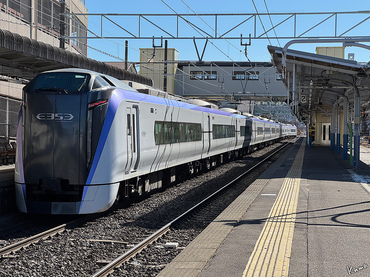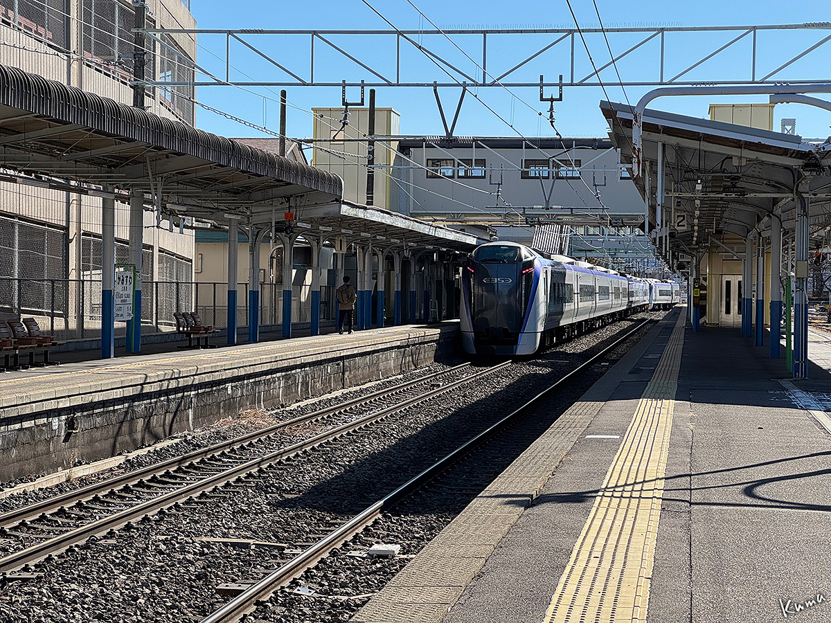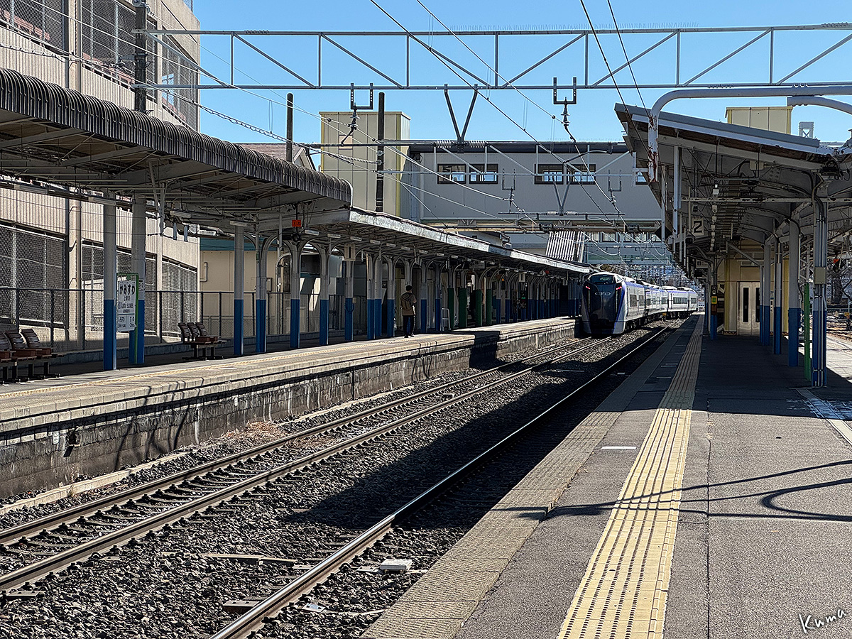 投稿日: 2026年2月14日2026年2月13日 投稿者: くまぱぱ上諏訪駅を発車するあずさ 特急あずさが上諏訪駅上りホームを発車していく。 12両(基本9両+増結3両)の長い編成の東京行きだ。 上諏訪駅は単線区間にあるので、特急でもポイントを通過して本線に出る。 12両全てがポイントを通過するまで速度は上げられない。 単線区間が複線区間より時間がかかるのはそういう事情もあるのだ。