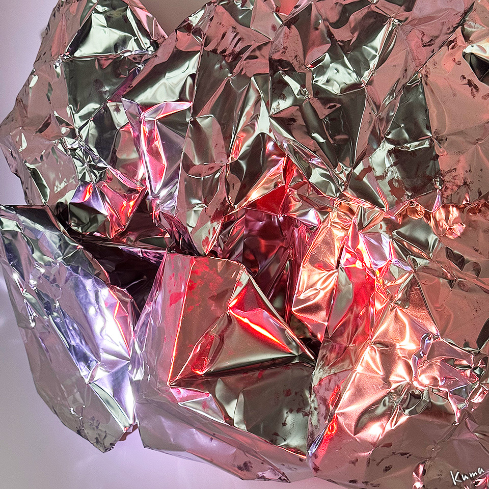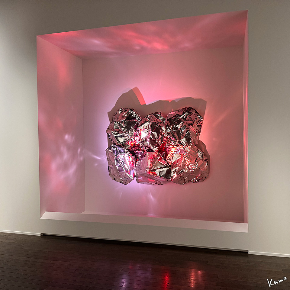 メタリックな表面と照明の色のマッチが面白い立体作品。