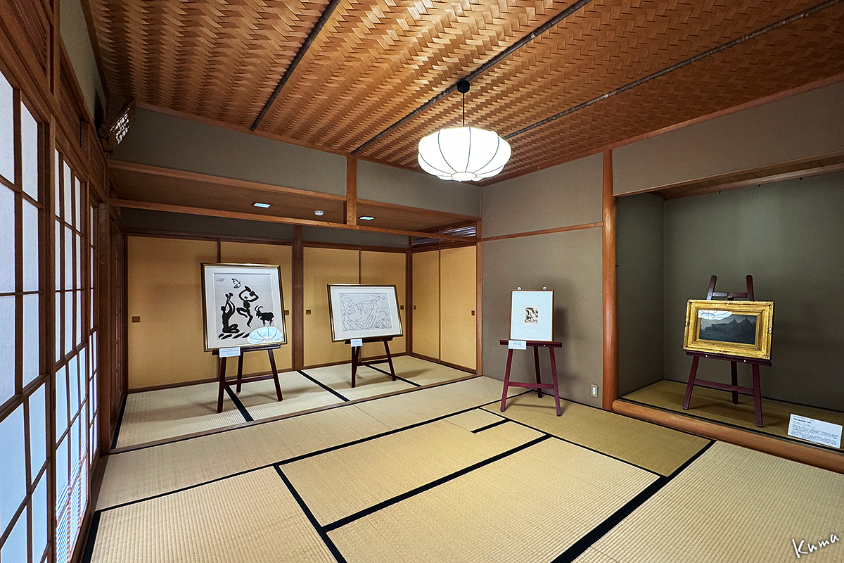 アートショップの奥に茶室風の和室があり、作品が展示されている。一番左はパブロ・ピカソの「フルート奏者」(リトグラフ)。