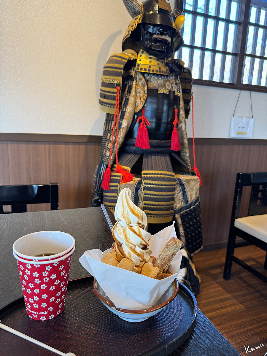 鎧などが飾られていめ店内。コーヒーなどの飲み物と軽食が用意されている。写真は信玄ソフト。