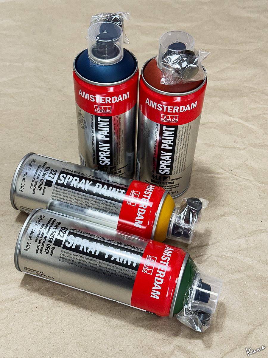 AMSTERDAMスプレーペイント。アクリル絵の具のAMSTERDAMと色を合わせてある水性アクリルペイント。
