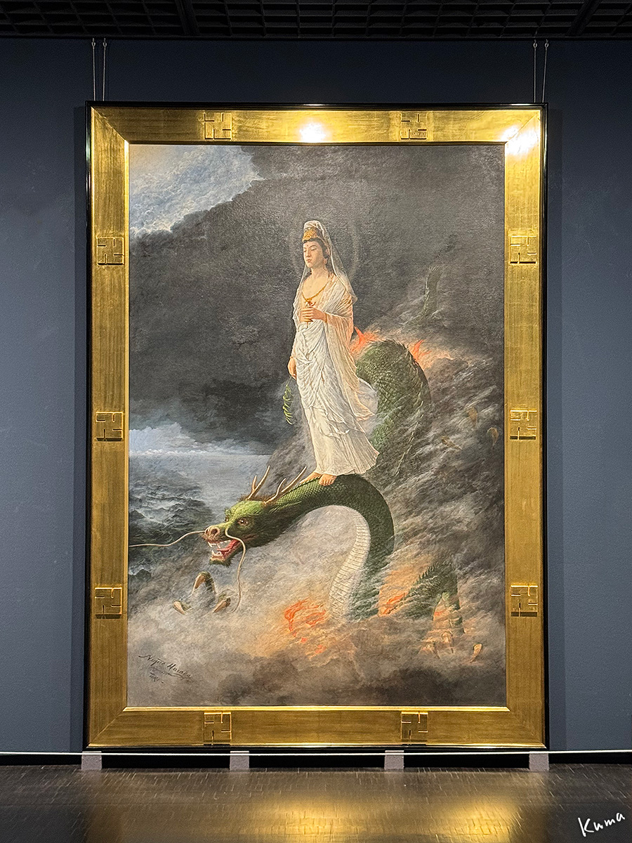 「騎龍観音」原田直次郎。ドイツで油絵を学んだ画家が、日本画的モチーフをキャンバス上に油彩で精密に表現している。