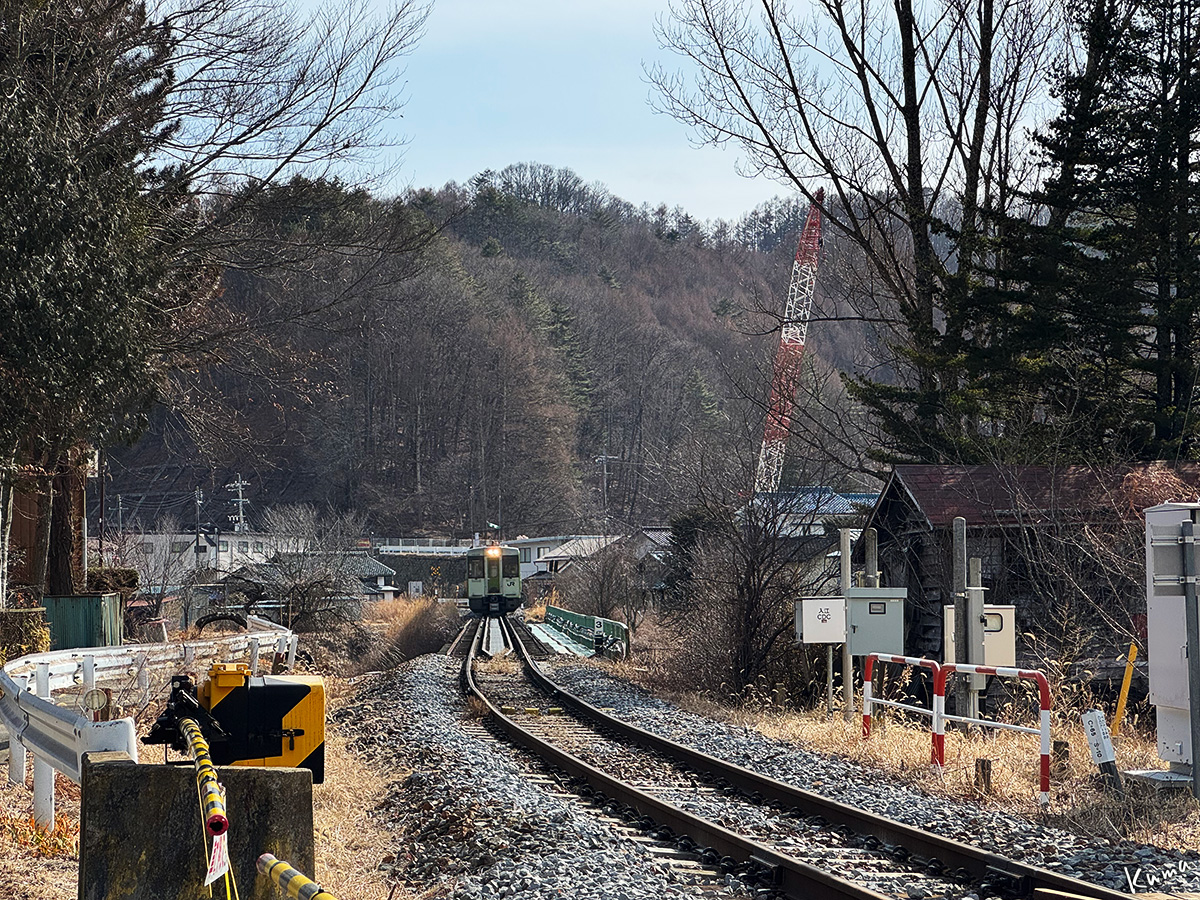 投稿日: 2026年4月17日2026年4月16日 投稿者: くまぱぱ鉄橋を渡る列車を正面から 対岸のカーブの向こうから列車が現れた。 この川は千曲川。鉄橋は第5千曲川橋梁だ。 鉄橋に限らず、列車を正面から撮るのは難しくない。 手前に適度なカーブがあり、直線の延長線上にカメラを構えられることが条件。 ここの場合、カーブの途中に踏切があり線路に近付けるのも好条件だ。