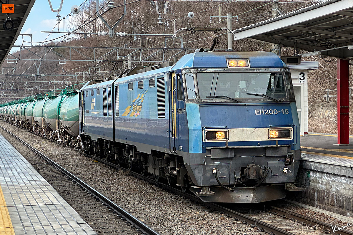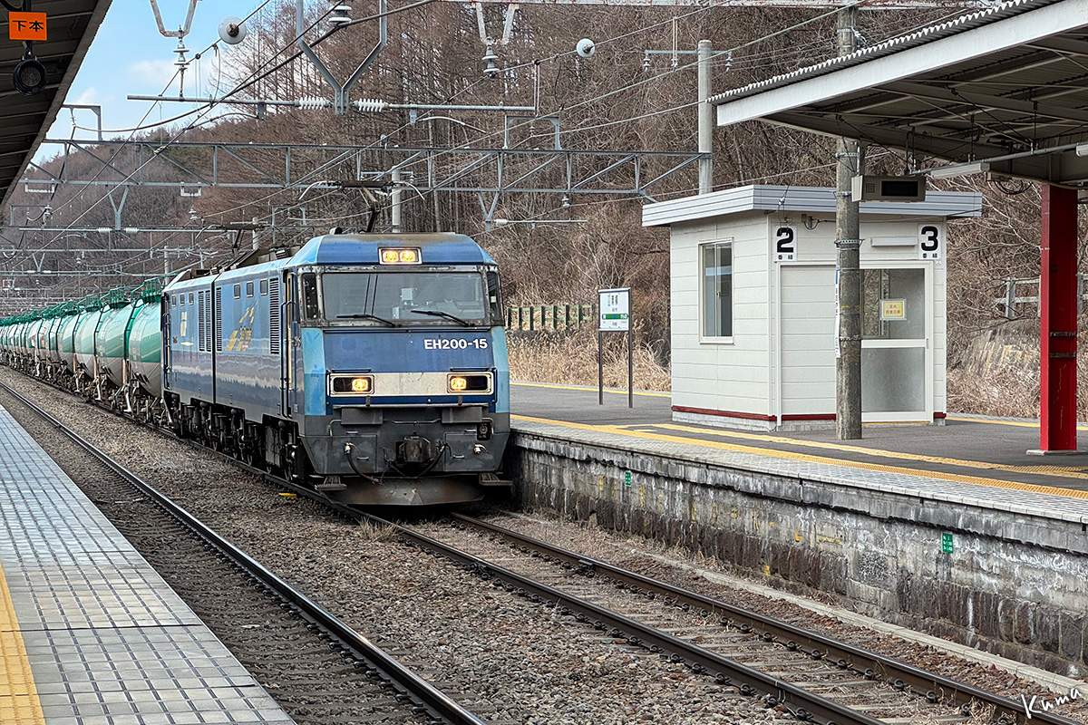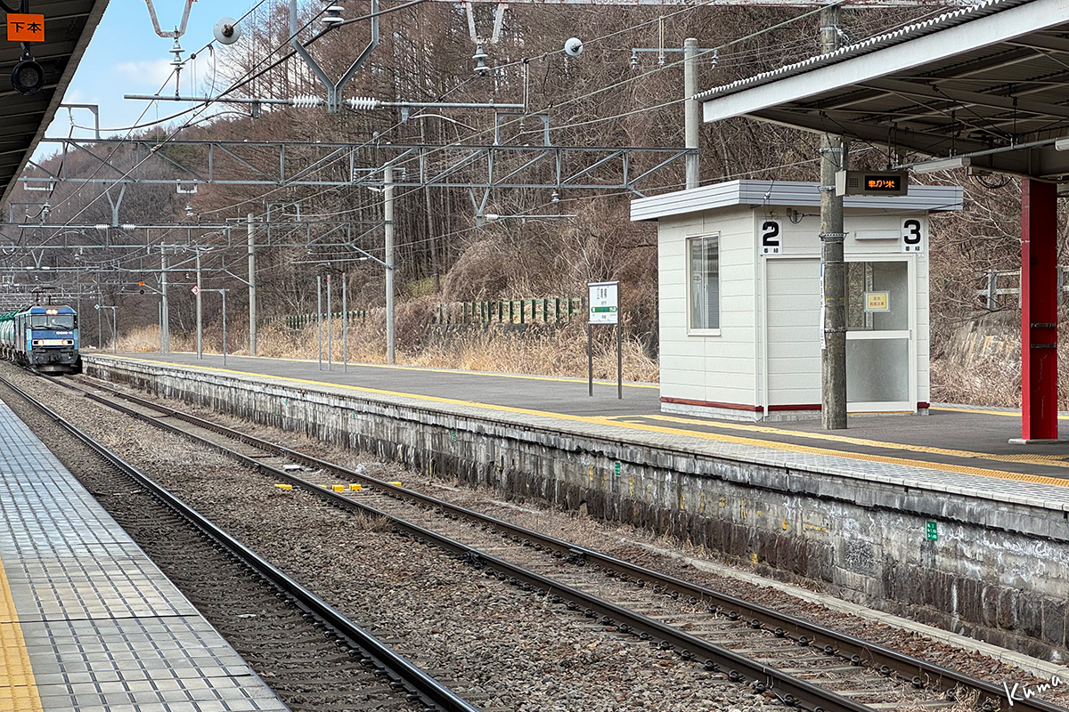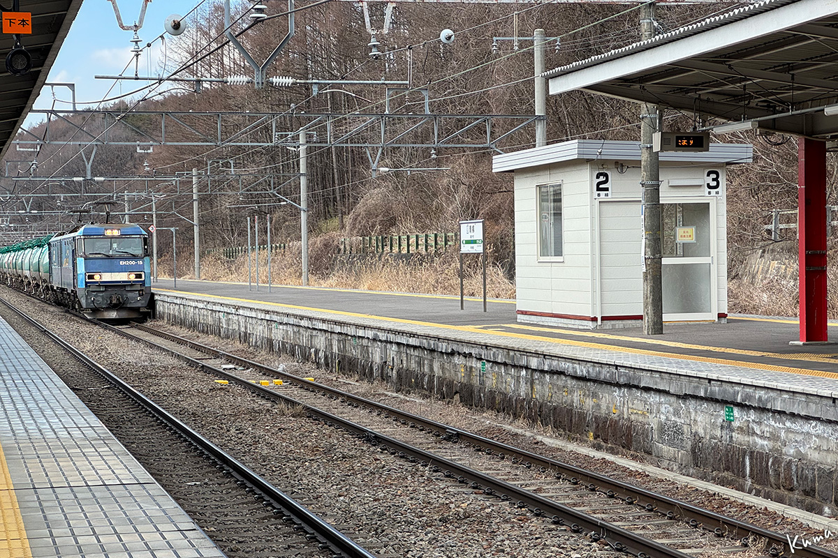 投稿日: 2026年4月22日2026年4月21日 投稿者: くまぱぱ貨物列車到着 お馴染みの青柳駅だ。 何度もご紹介しているが見逃せない。 ここは貨物を扱わない駅なので通過するのが普通なのだが・・ この午後の上り貨物は特急通過待ちのために停車する。 しかも待避線の2番ホームは、1番ホーム側からなら下回りまで完全に見える。 これを見逃しては鉄道好きと言えないだろう。