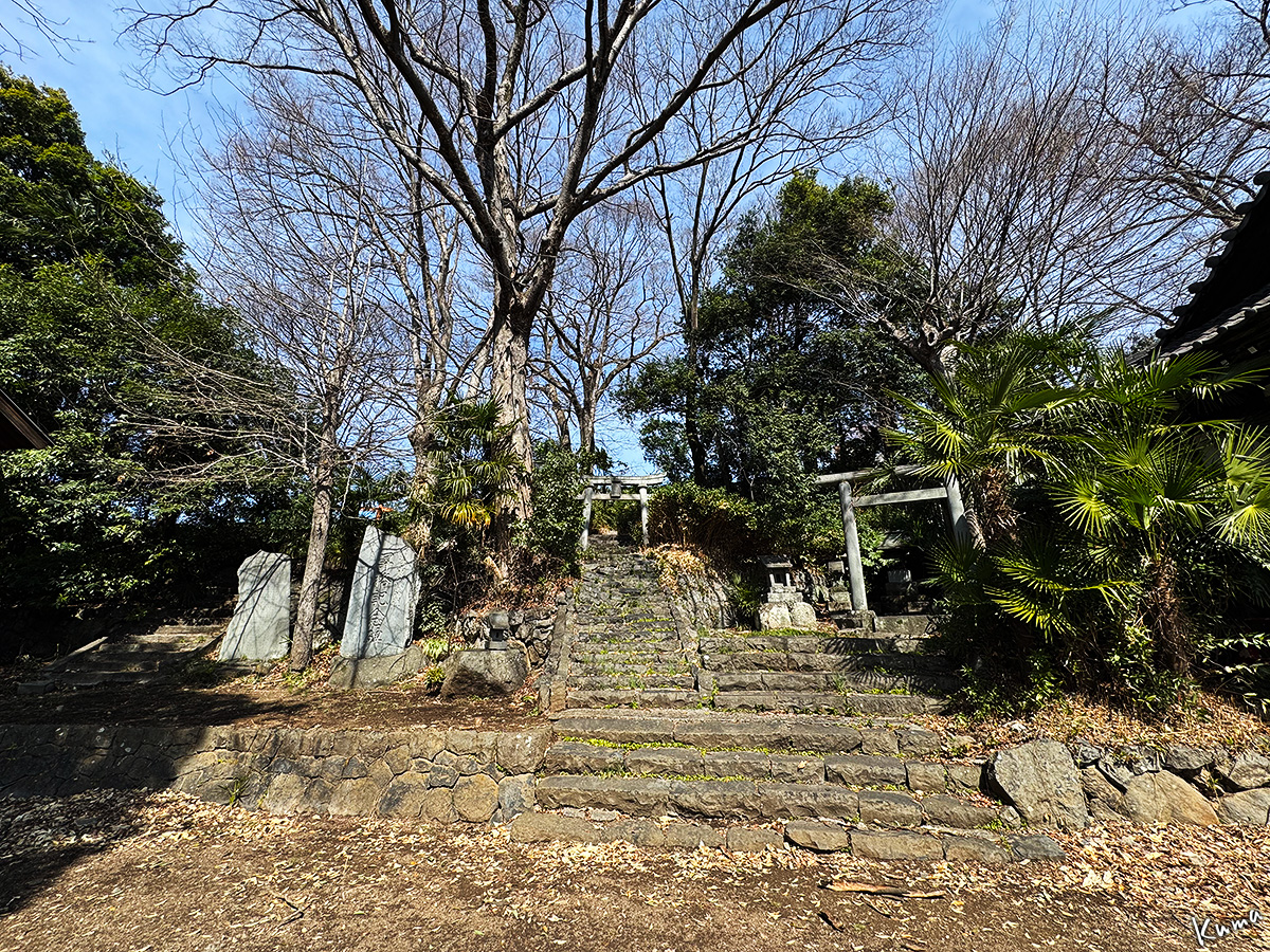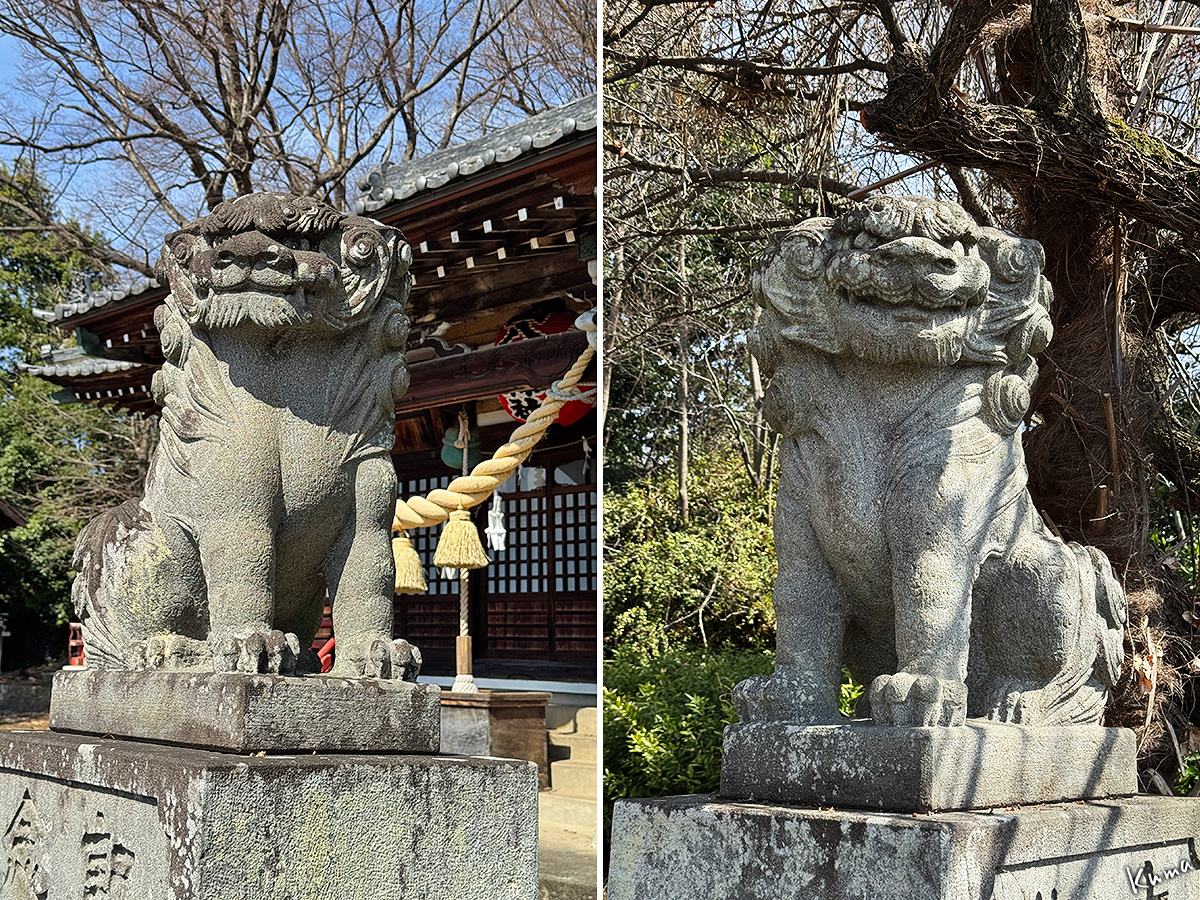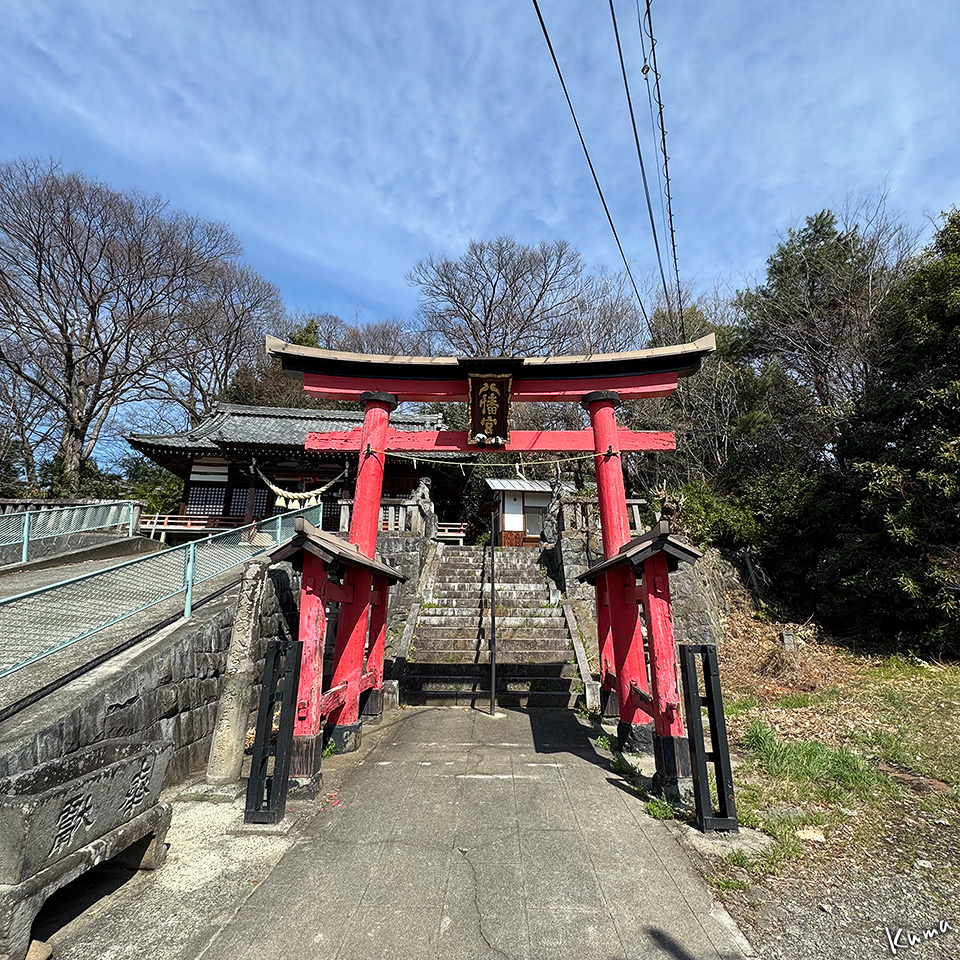 投稿日: 2026年4月24日2026年4月23日 投稿者: くまぱぱ山八幡神社 身延線金手駅のすぐ近くにある神社。 大きくはないが赤い鳥居がいい佇まいだ。 鳥居をくぐって石段を上るとこんな狛犬が迎えてくれる。よく見るアニメ顔ではない独特の毛の表現と表情が力強い。 これが社殿。鳥居の正面から西に少しズレている。 三日月状に下がった太い注連縄が独特の雰囲気。 社殿の西側には裏へ続く石段があり、石の鳥居もある。 時間がなくて確認できなかったが、小さな祠のある鎮守の森になっているようだ。 上の石段がある前が小さな広場になっていて、その西端に舞殿がある。例祭のときには舞が奉納されるのだろうか?